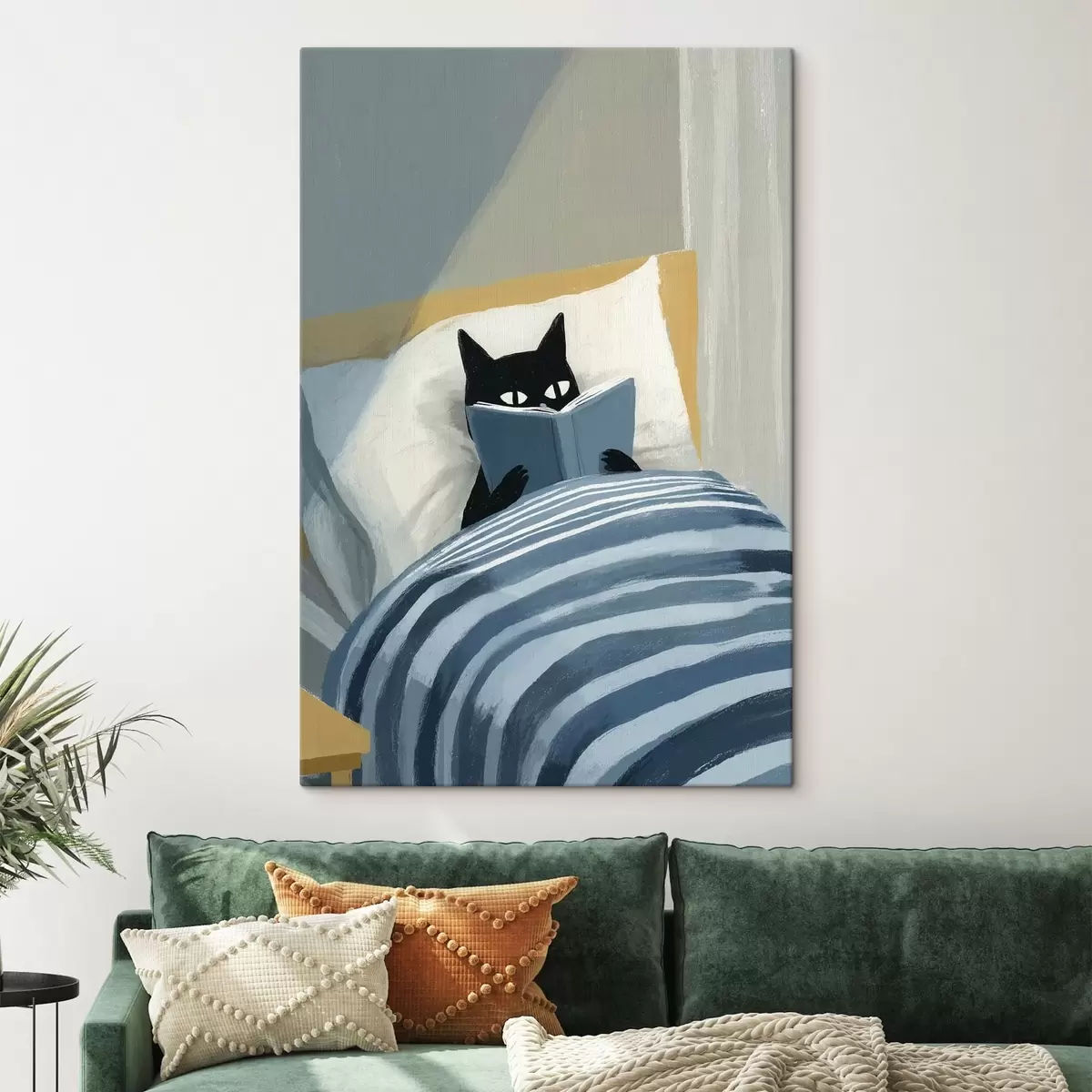 Glezna minimāla plakana ilustrācija, kurā attēlota melna kaķe, kas gultā lasa grāmatu s48117