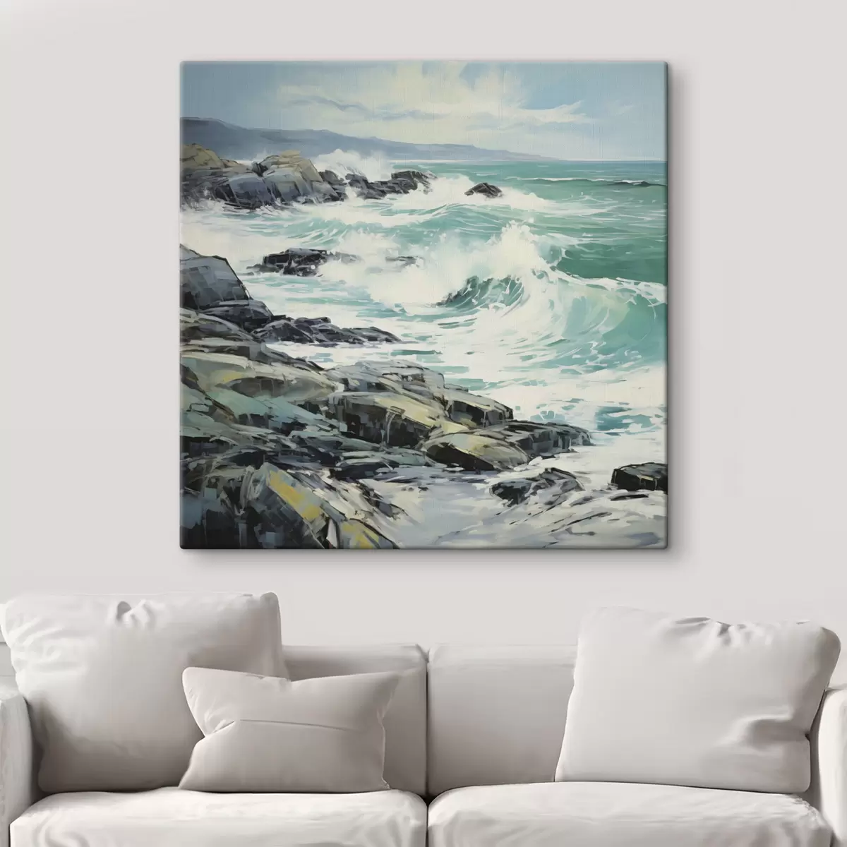 Glezna Akmenskrastu ainava ar viļņiem zem apmākušām debesīm, glezniecības stils Nr s48388