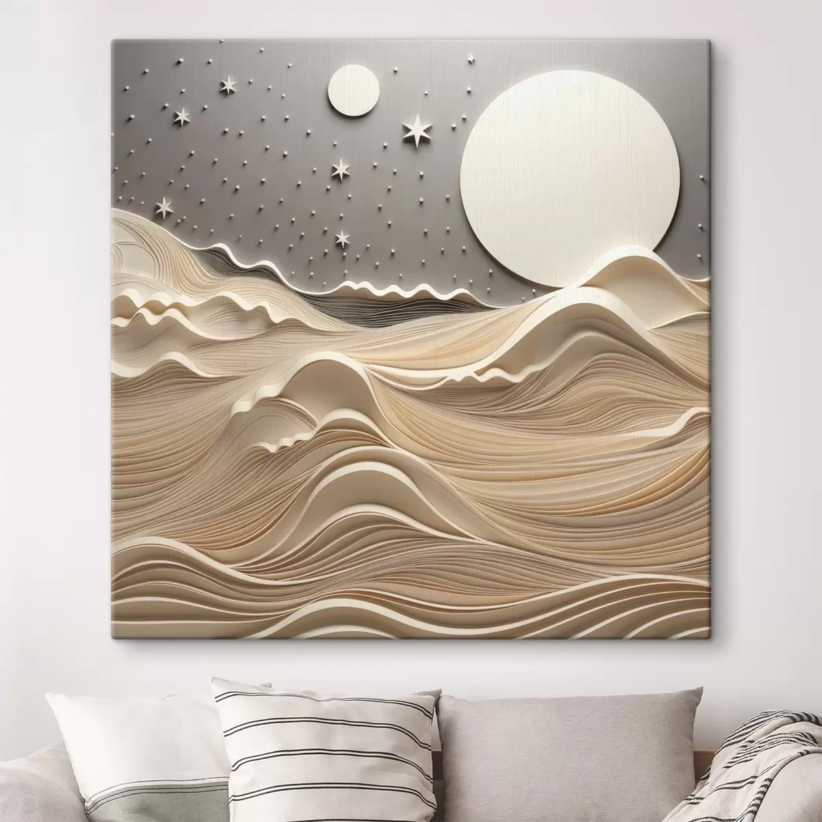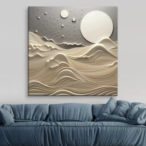 Glezna Minimālisma stilā veidots ainavas attēls ar līdzenām pakalnu grēdām un lielu mēnesi zvaigžņotā debesīs, abstraktā māksla Nr s48401
