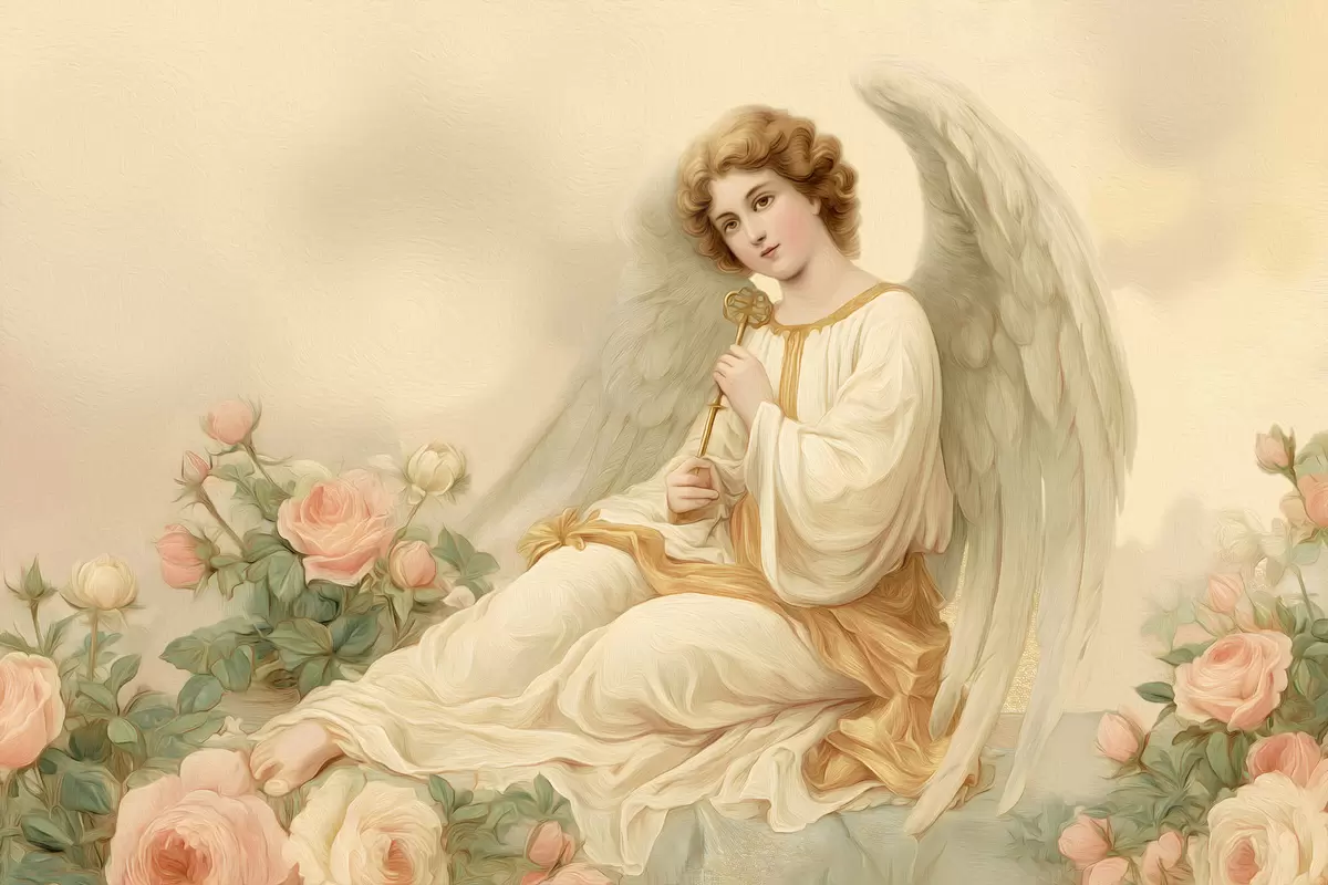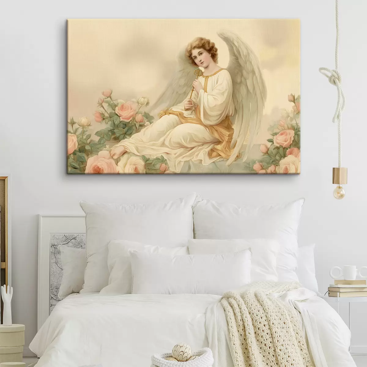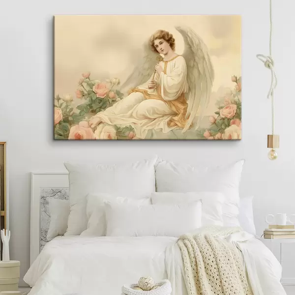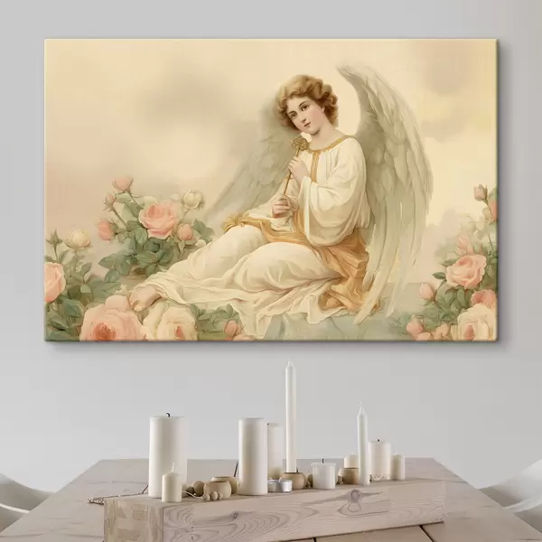 Glezna eļļas gleznas stilā attēlots eņģelis ziedu vidū Nr s48554