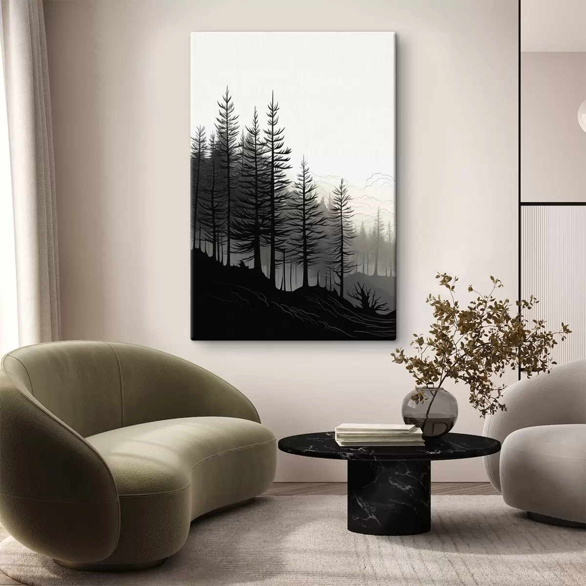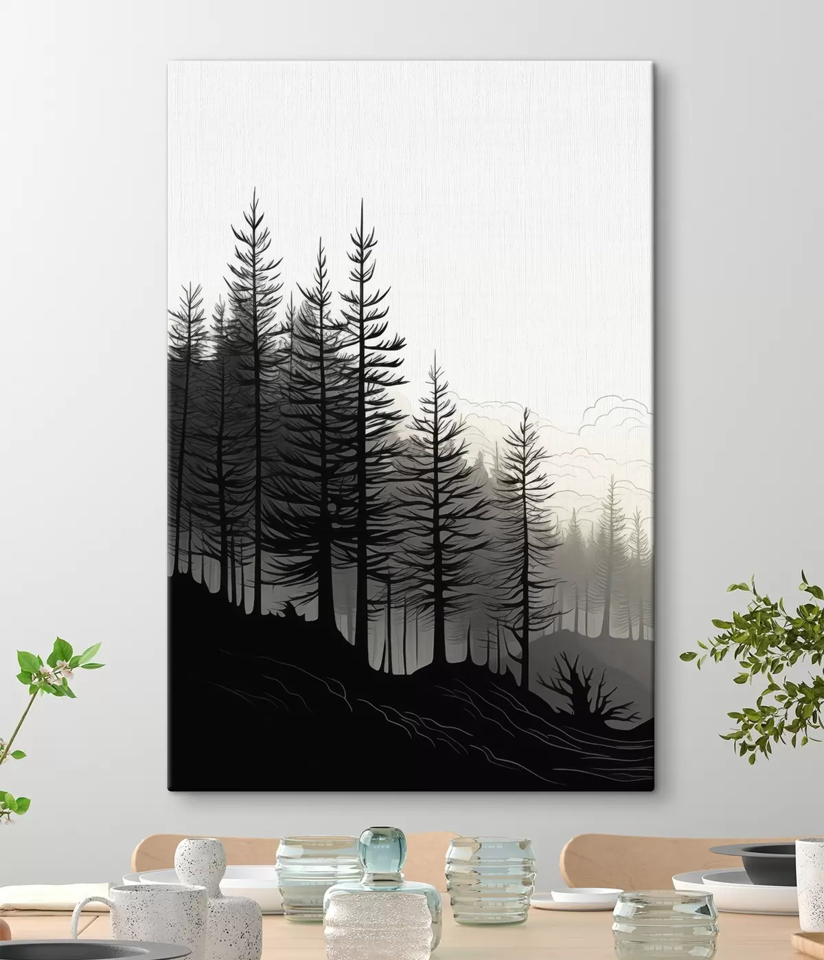 Glezna Miglas apklāts mežs, melnbalta ainava Nr s48573