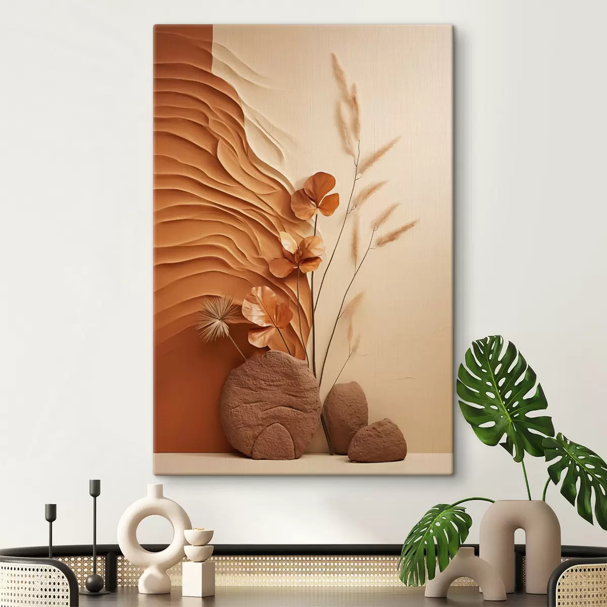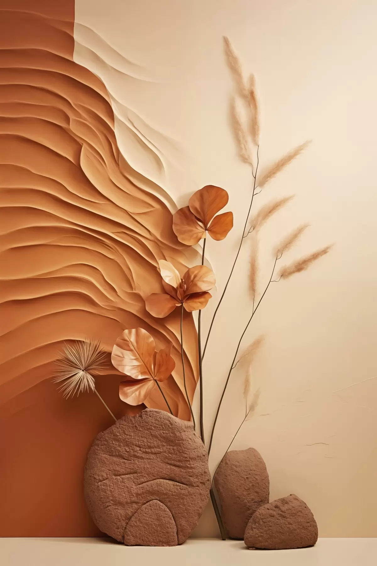 Glezna Minimālisma stila mākslas darbs ar kaltētiem ziediem un pampas zāli, faktūru fonu Nr s48739