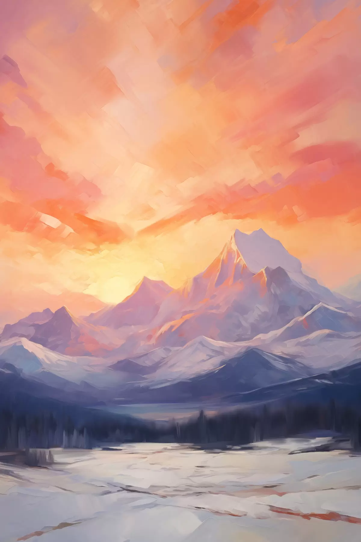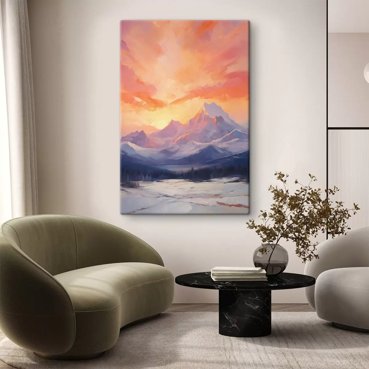 Glezna Sniega klātie kalni zem košā oranžā un rozā debesu velves ar mākoņiem Nr s48741