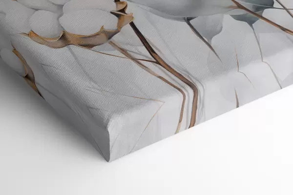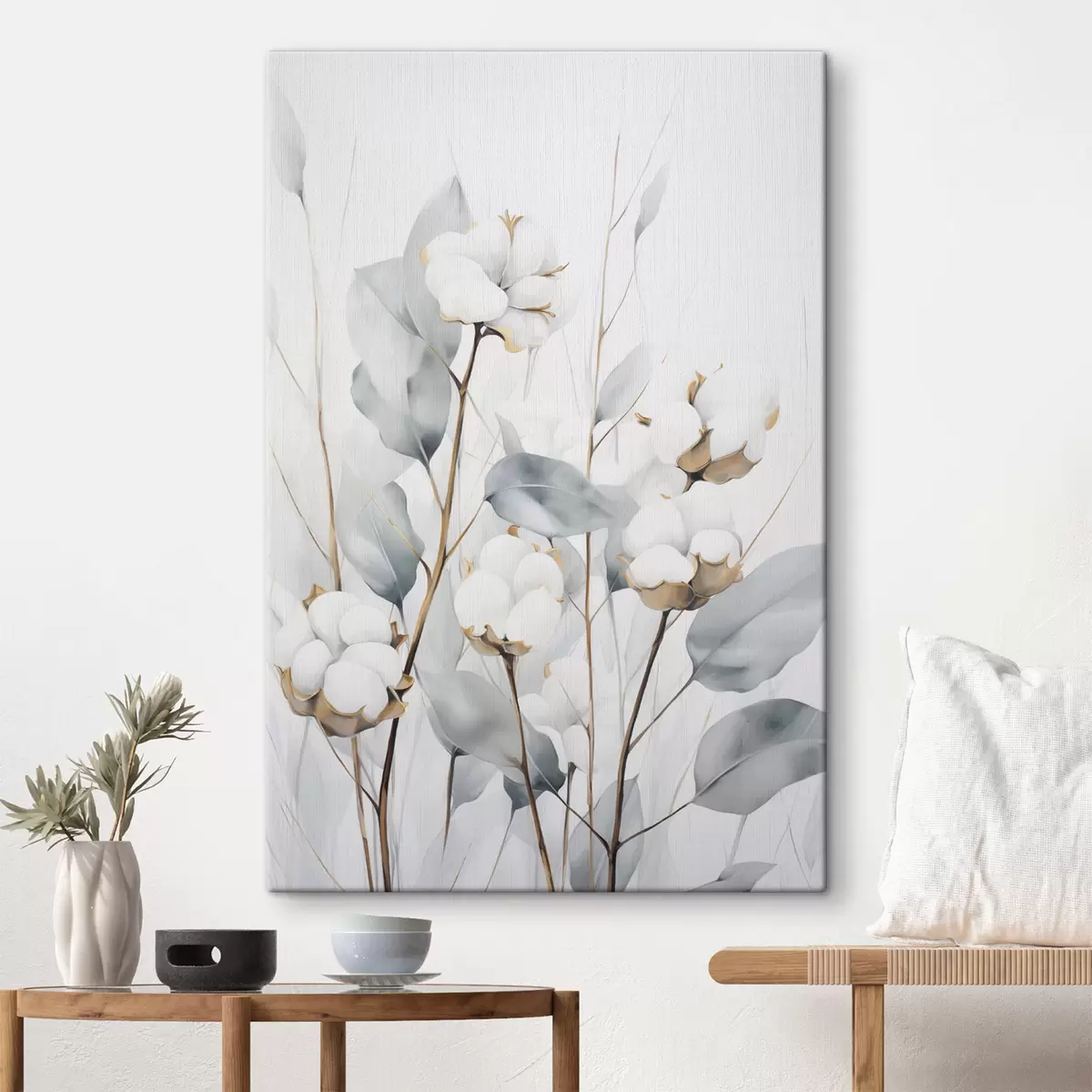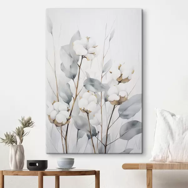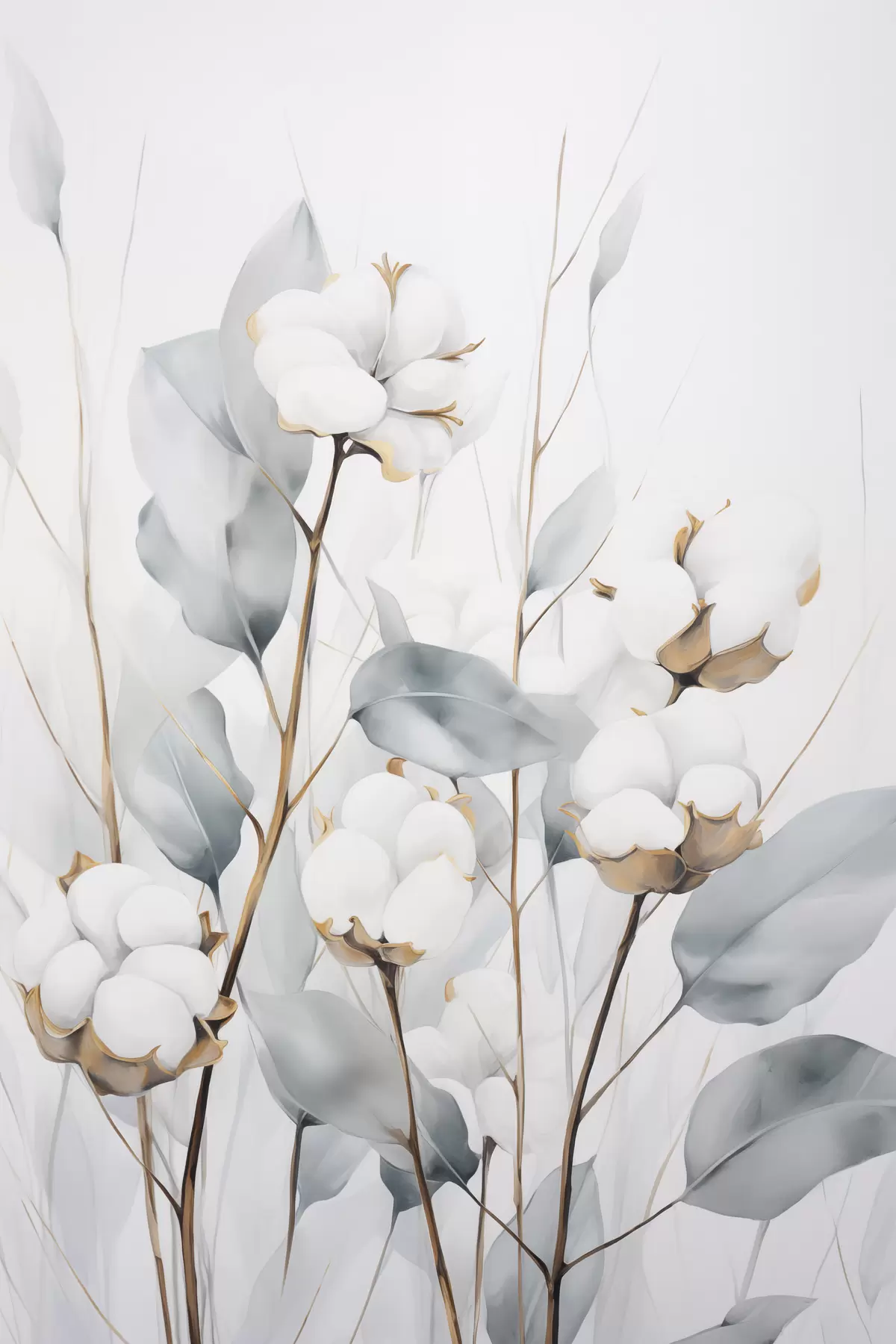 Glezna Balta kokvilnas auga ar gaiši zilsarkanām lapām uz gaiša fona Nr s48743