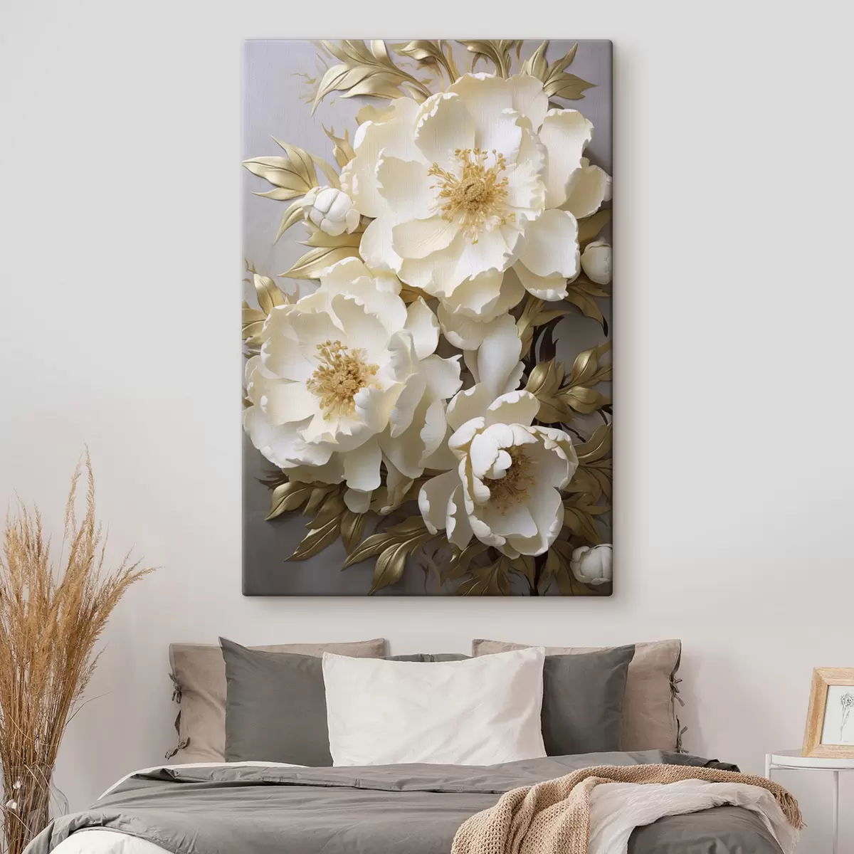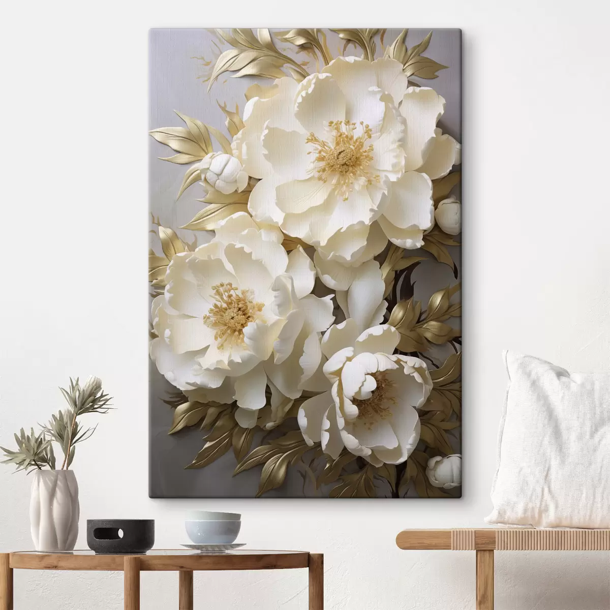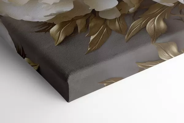 Glezna Lielas baltas peonijas ar dzeltenām lapām uz pelēka fona Nr s48754