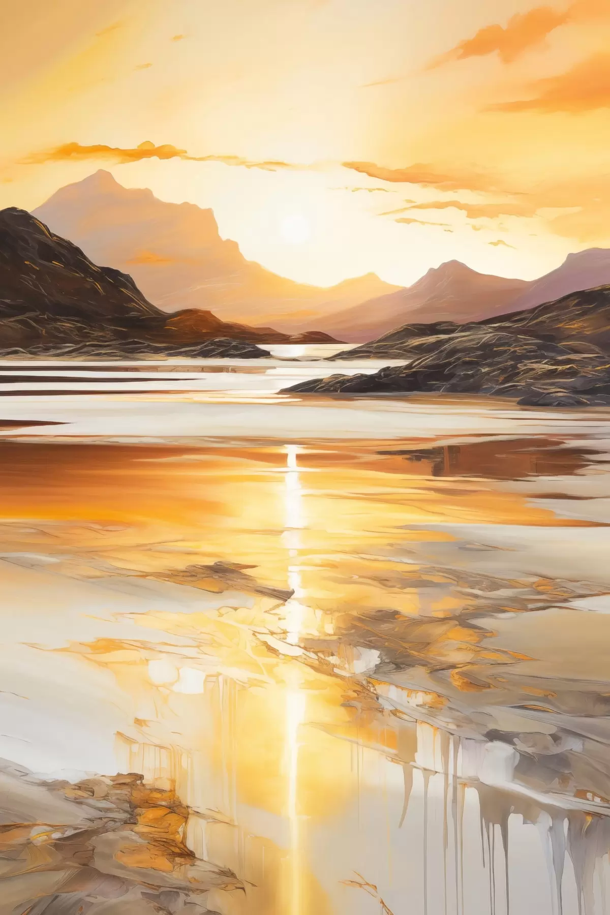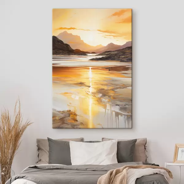 Glezna Ainava ar upi un kalniem zem siltā oranžā debesu velves, saulriets Nr s48755