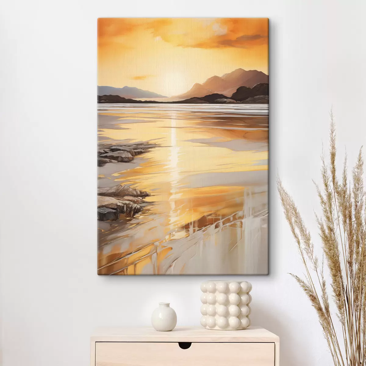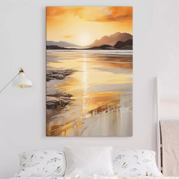 Glezna Ainava ar upi un kalniem zem siltā oranžā debesu velves, saulriets Nr s48756