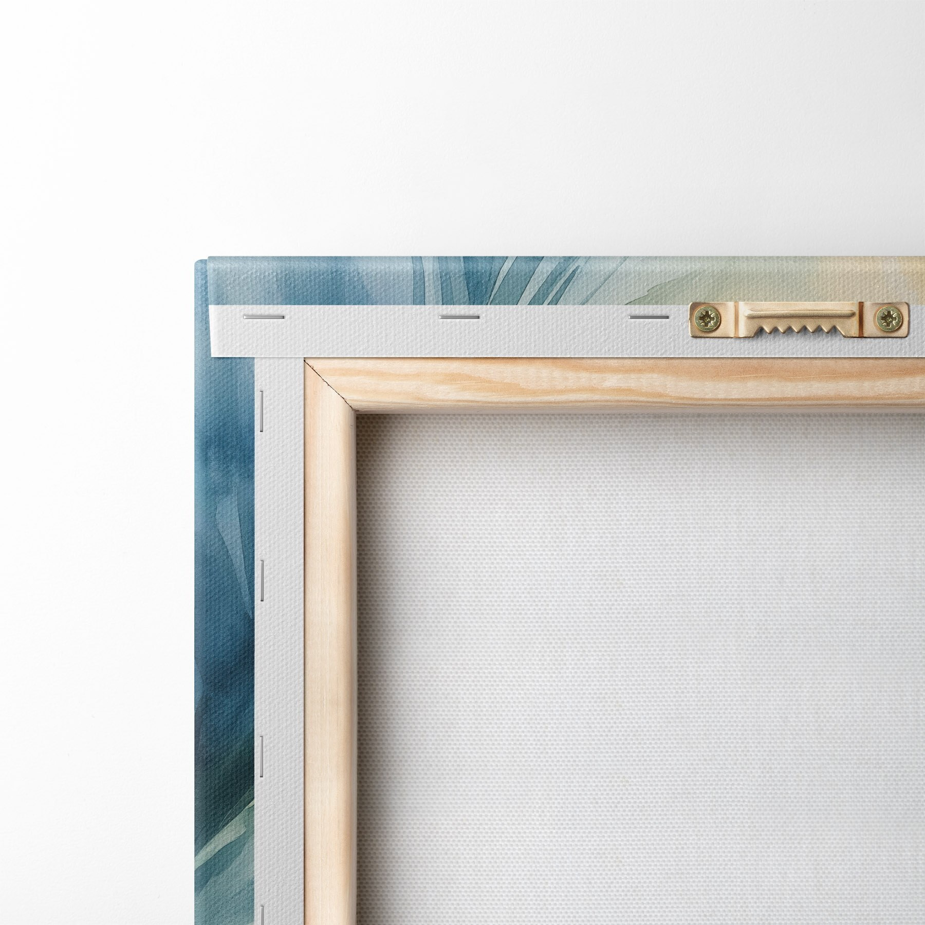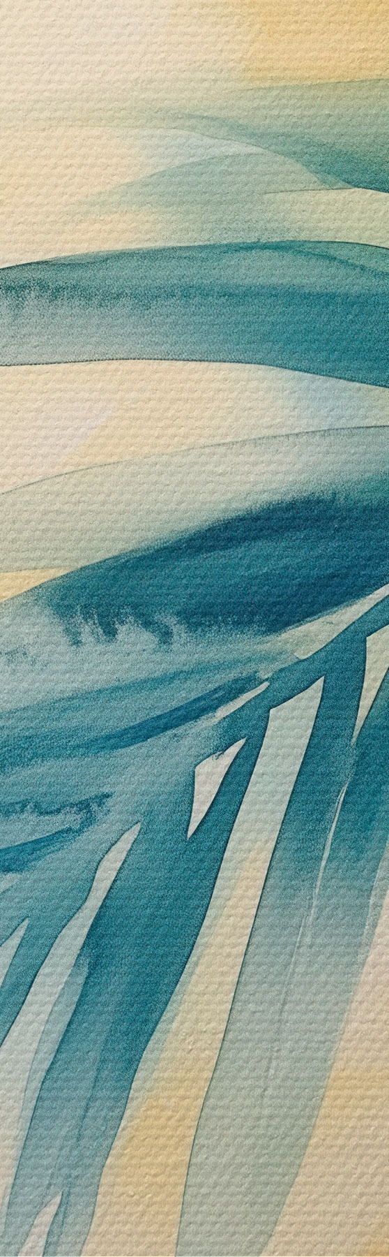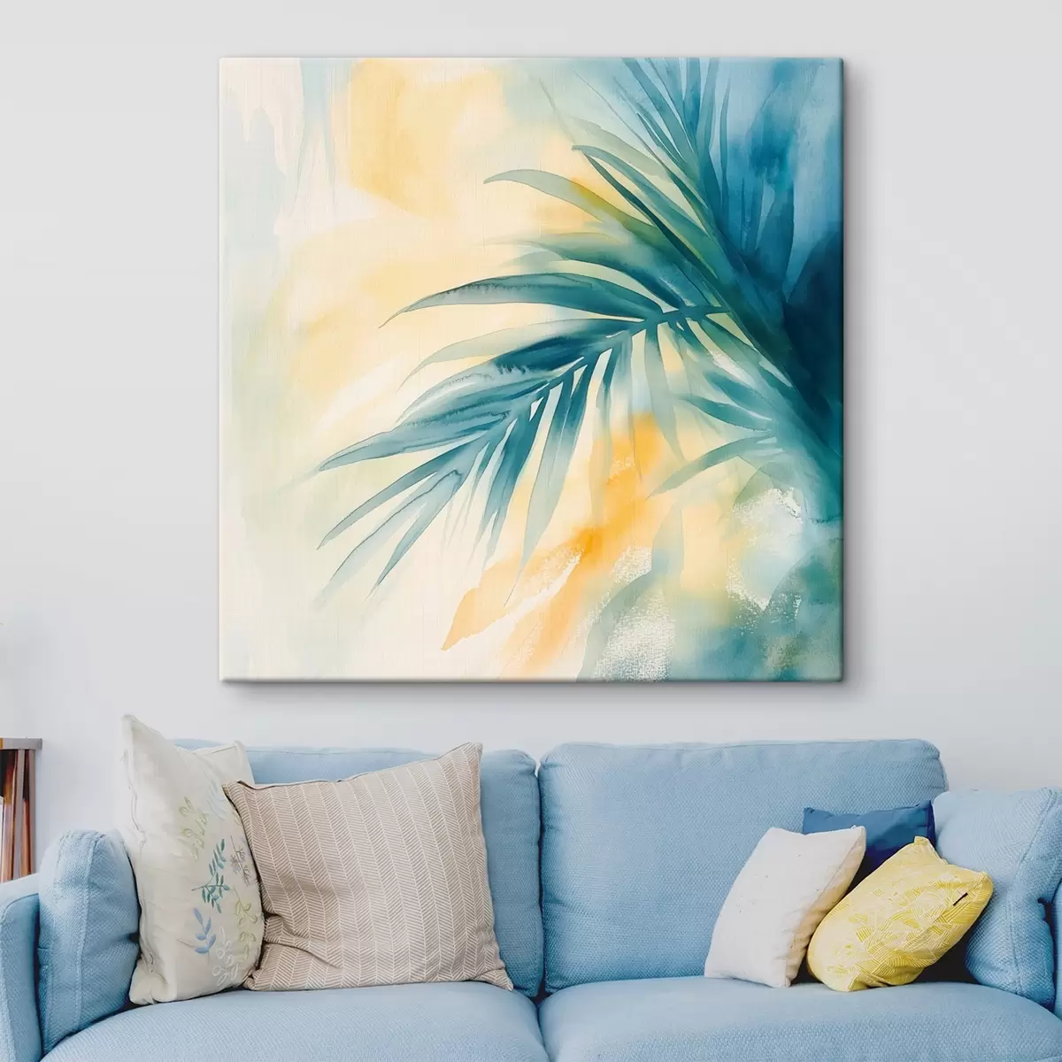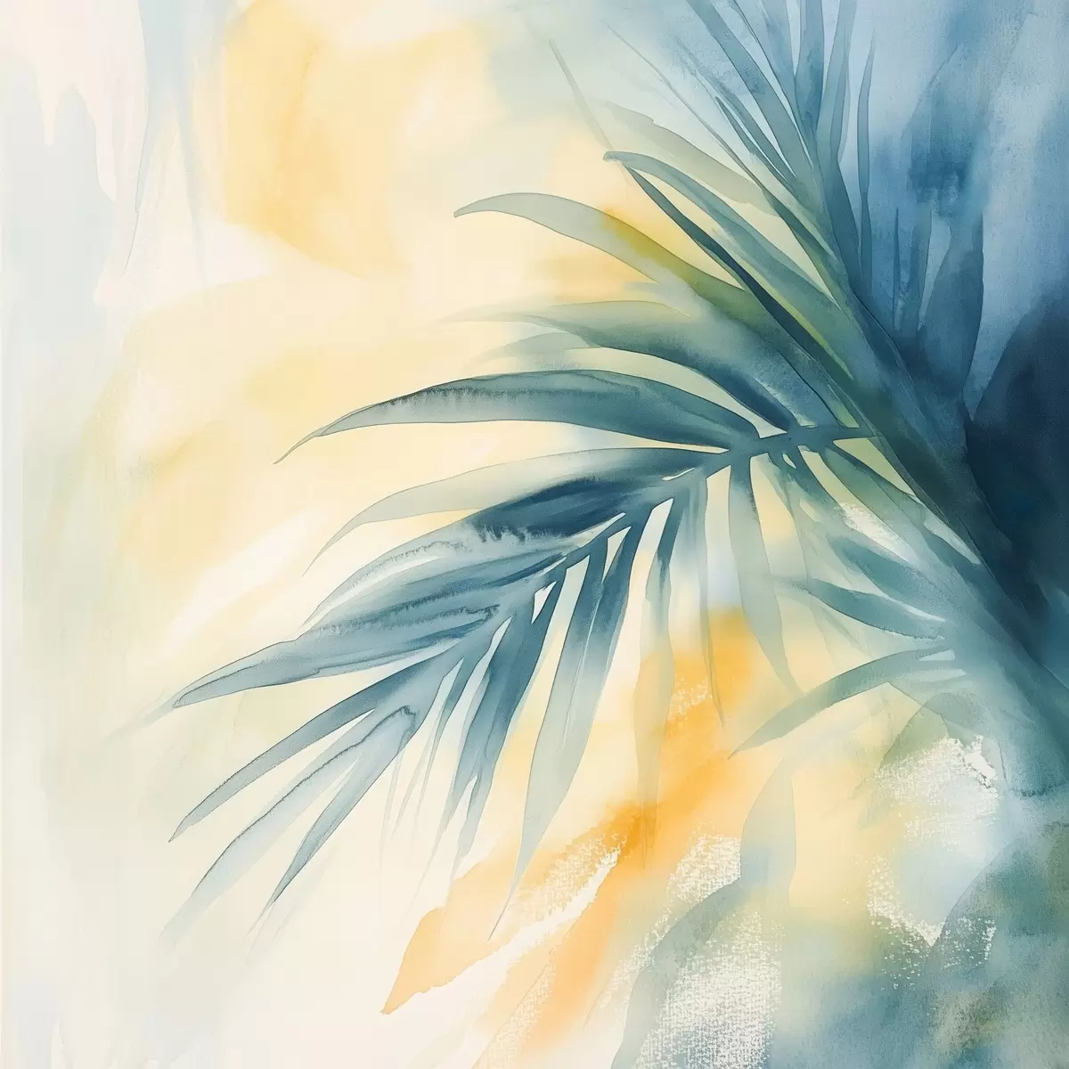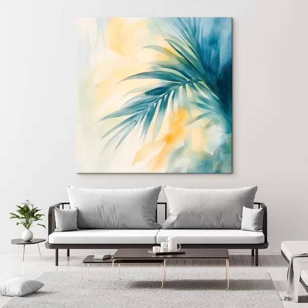 Glezna Tropu palmu lapas zili-tirkīza toņos uz siltu akvareļu plankumu fona Nr s48849