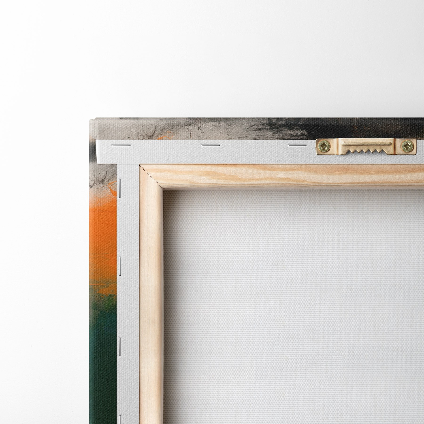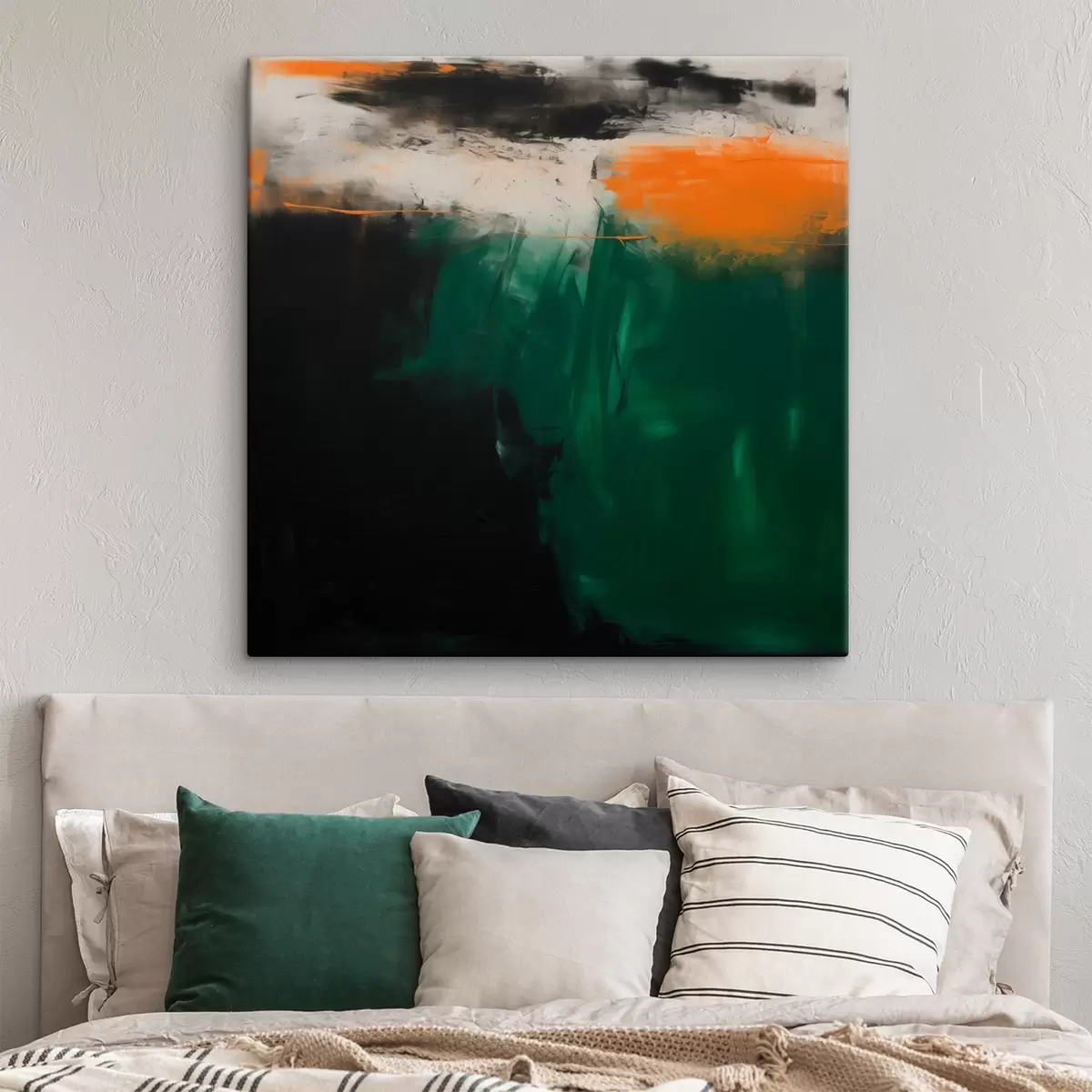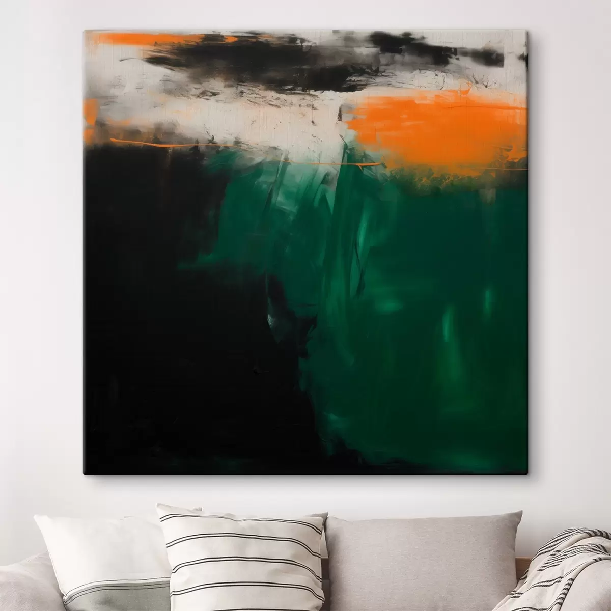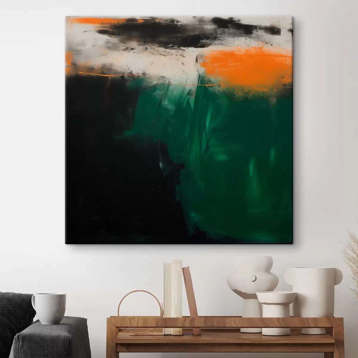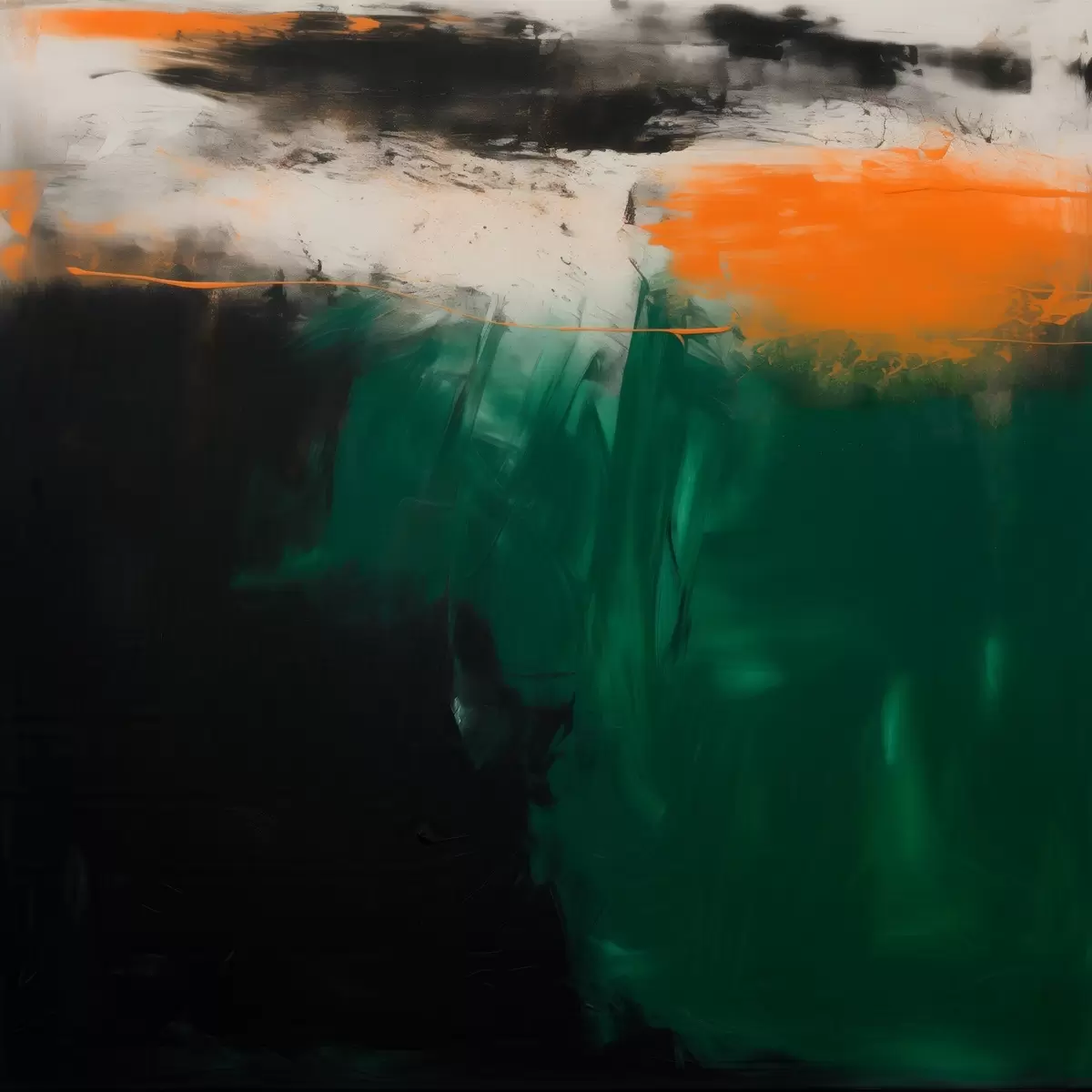 Glezna Abstrakcija ar oranžu akcentu un tumši zaļām otu triepienu līnijām mūsdienīgā glezniecības stilā Nr s48865