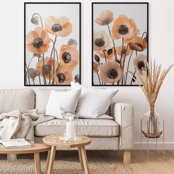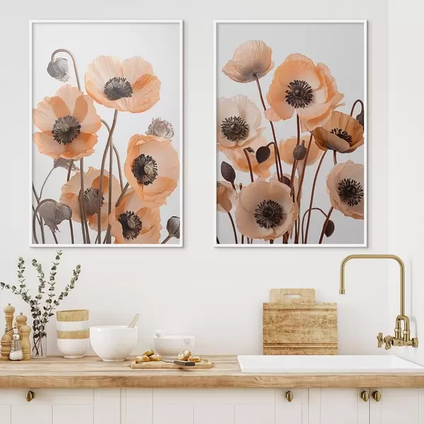 Plakāts Oranžās magones, kaltēti ziedi uz gaiša fona, maigs apgaismojums, maigi ziedlapiņas, ziedu kompozīcija Nr d00518