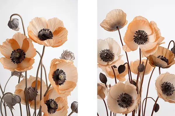 Plakāts Oranžās magones, kaltēti ziedi uz gaiša fona, maigs apgaismojums, maigi ziedlapiņas, ziedu kompozīcija Nr d00518