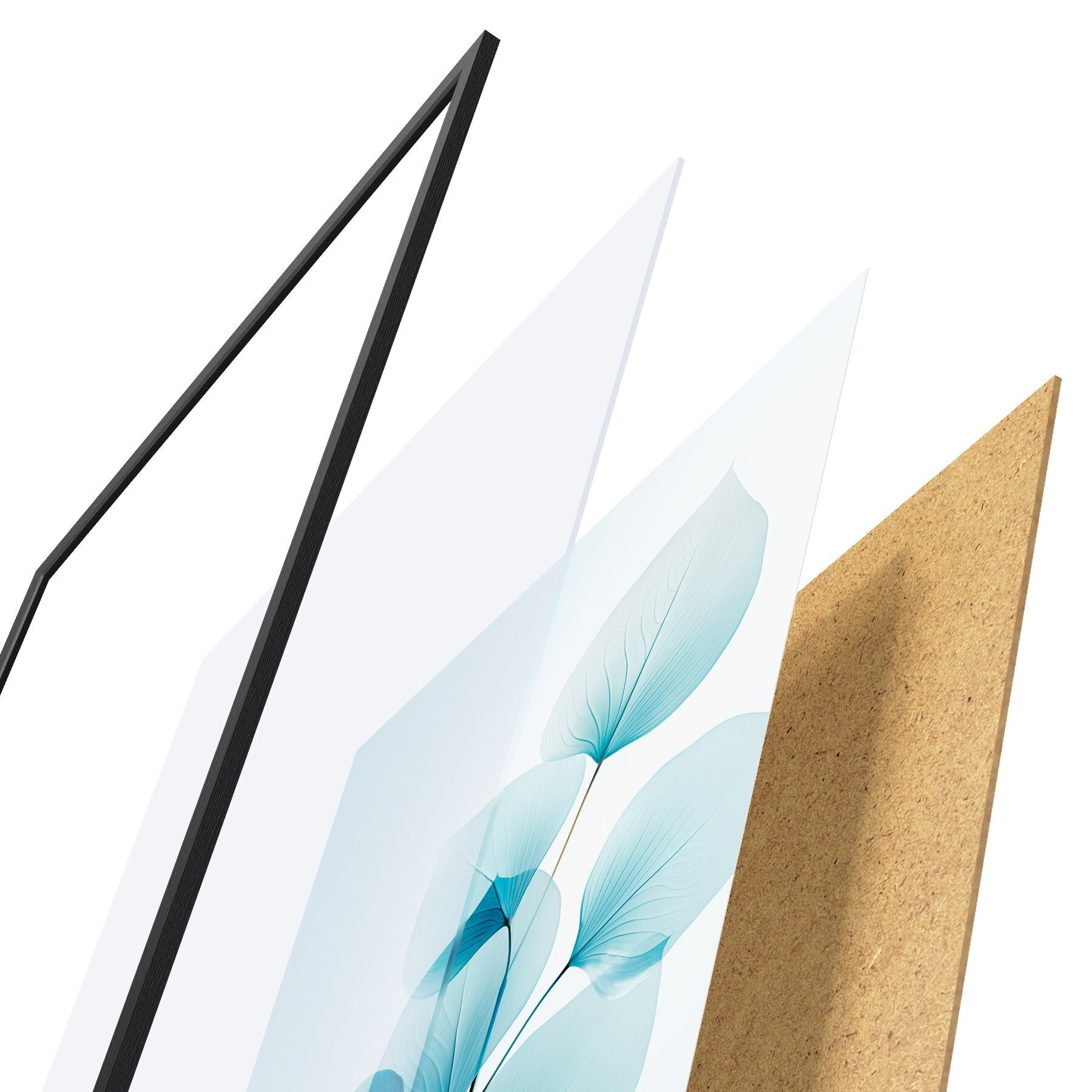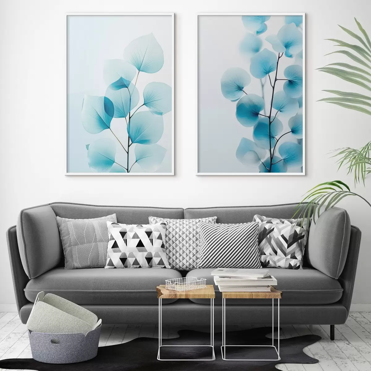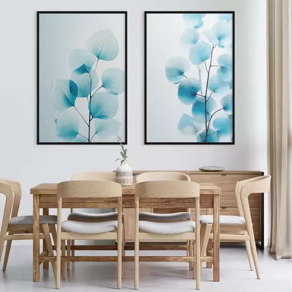 Plakāts Zariņš ar caurspīdīgām zilām lapām, redzamas maigas dzīslas, viegla un mierīga kompozīcija, minimālisma estētika Nr d00522