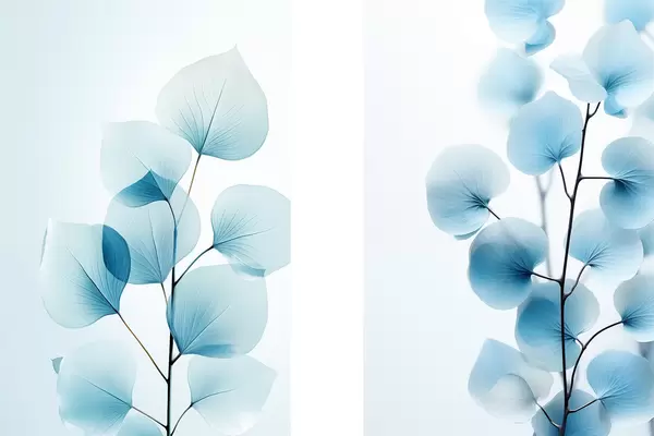 Plakāts Zariņš ar caurspīdīgām zilām lapām, redzamas maigas dzīslas, viegla un mierīga kompozīcija, minimālisma estētika Nr d00522
