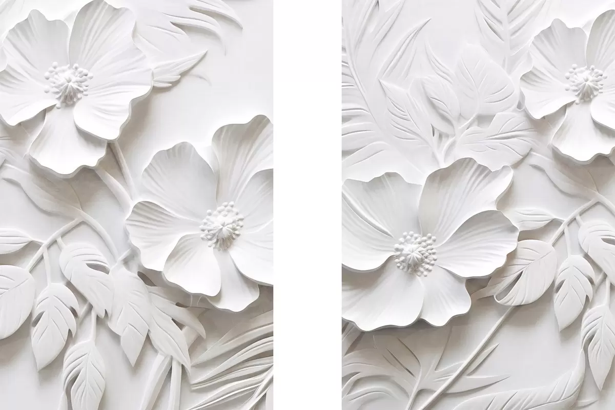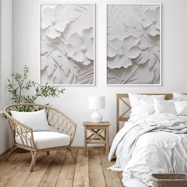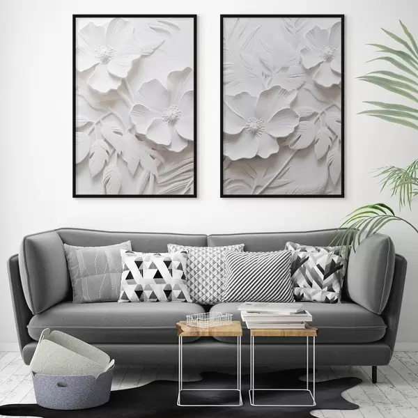 Plakāts Dekoratīvi minimālisma stilā veidoti balti ziedi ar lapām, reljefa imitācija, balts fons Nr d00524
