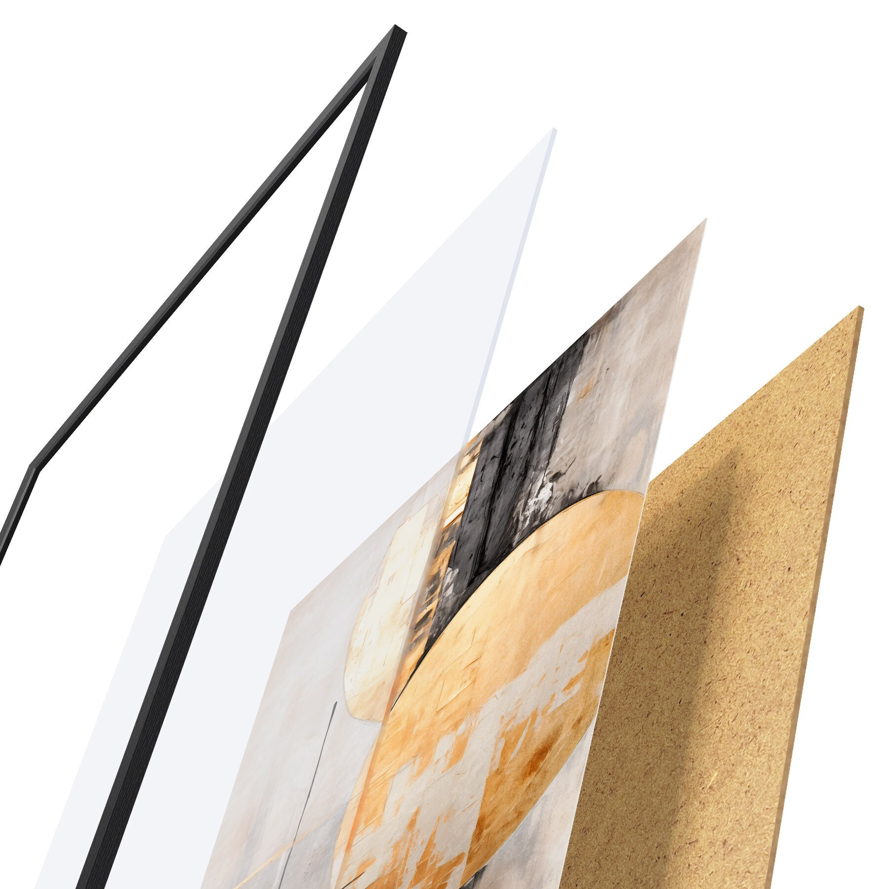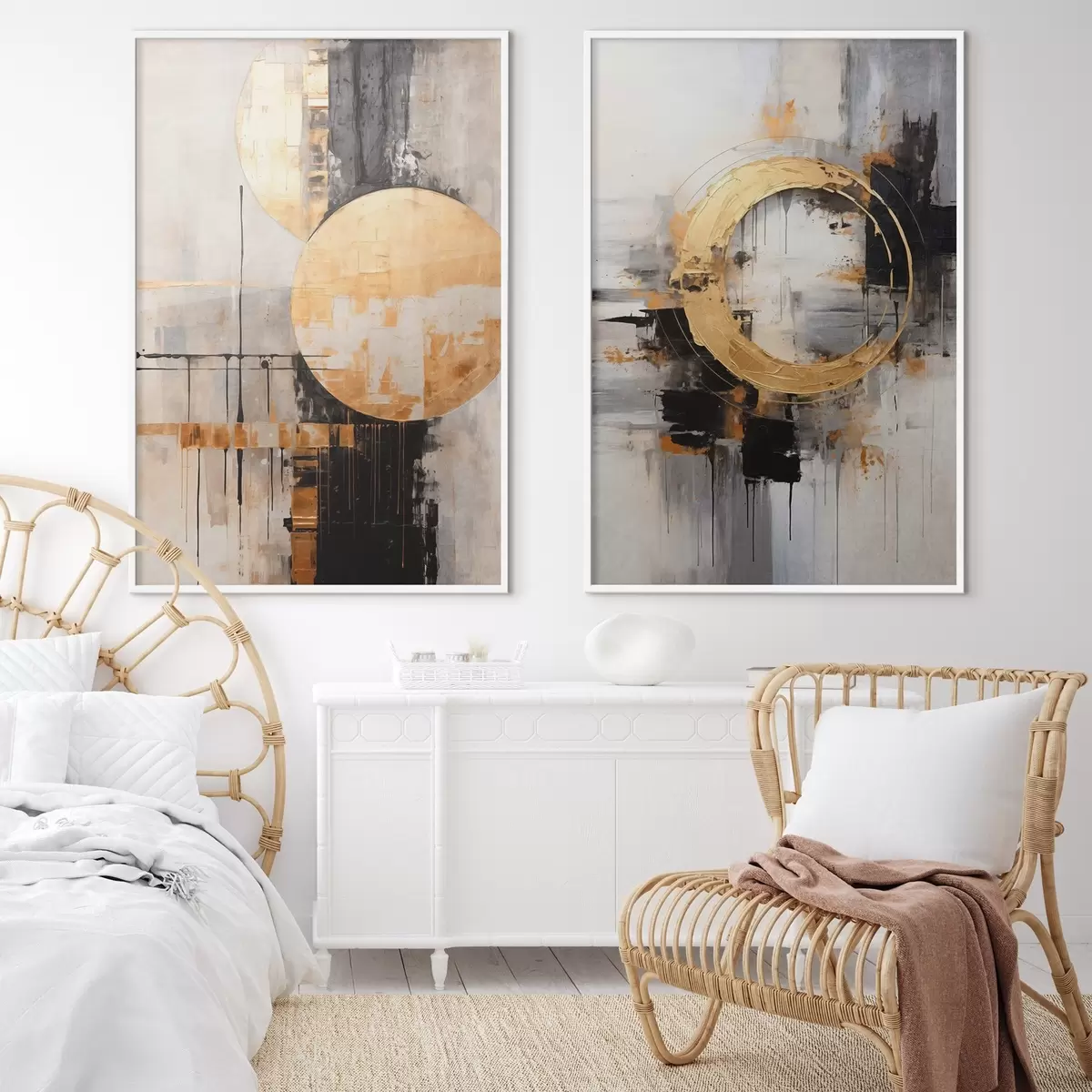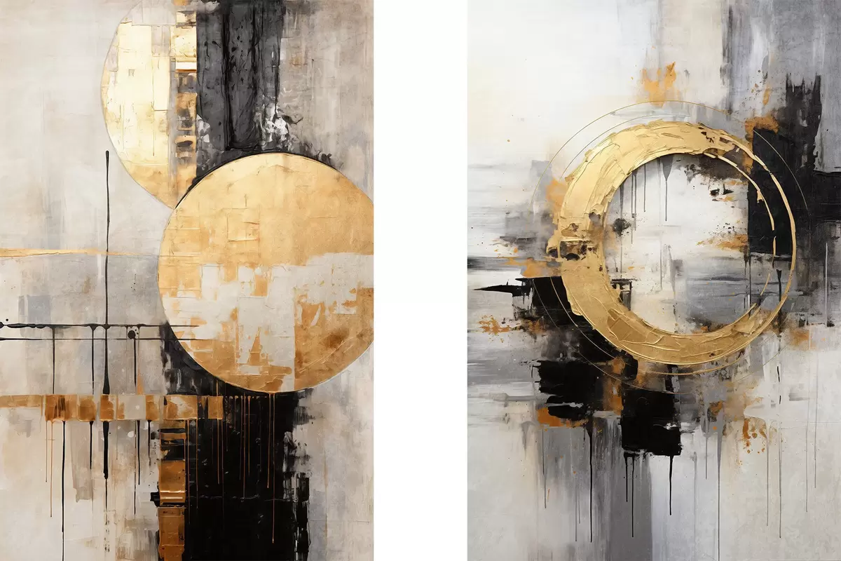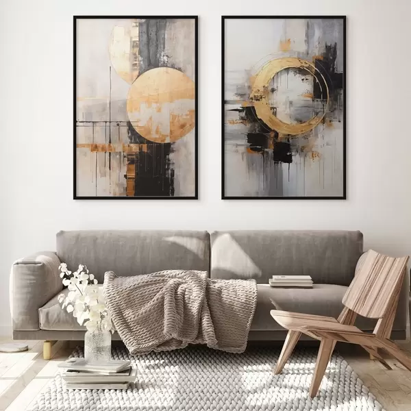 Plakāts Abstrakta glezna ar apļiem, melnām un dzeltenām līnijām un fonu ar pelēkiem un baltiem toņiem Nr d00527