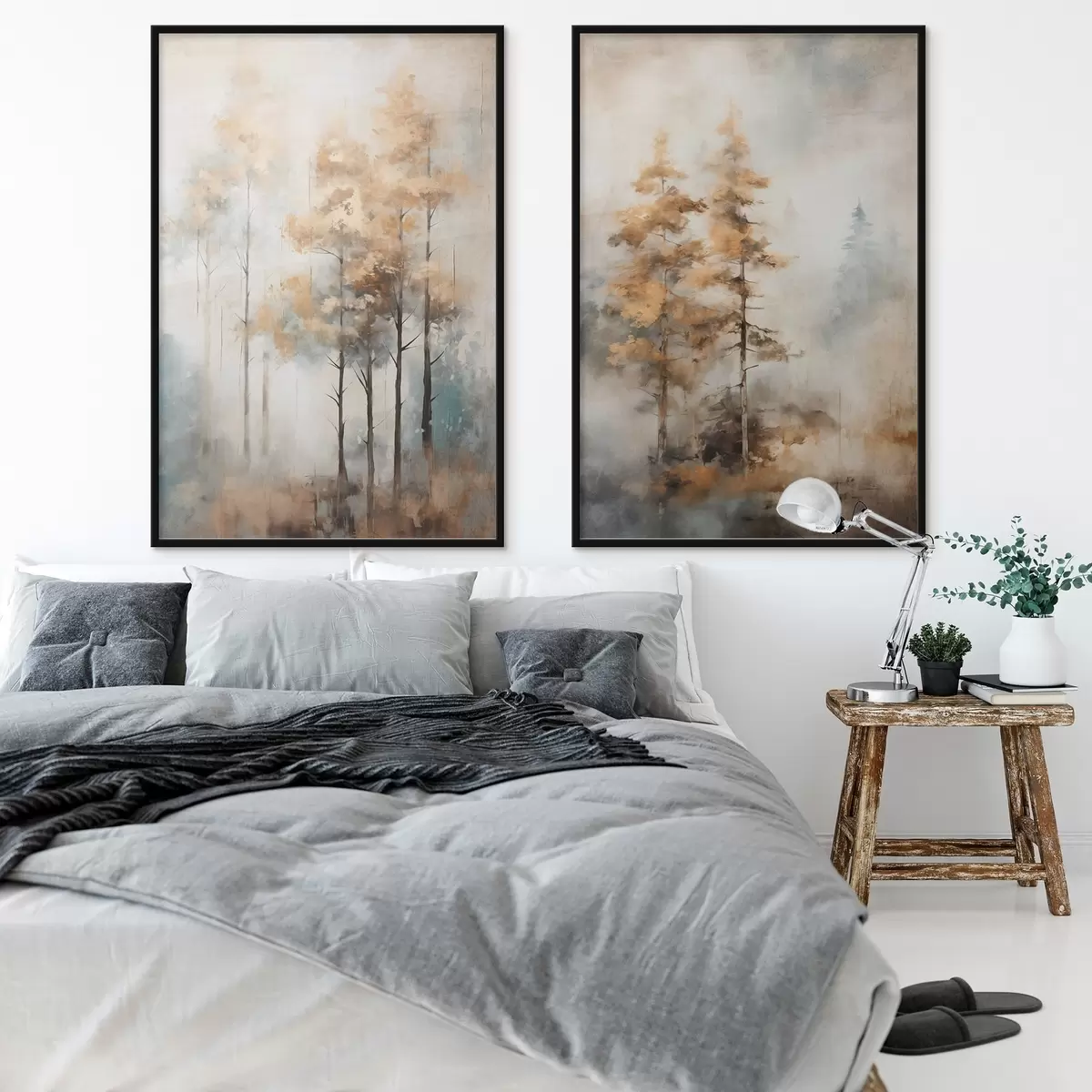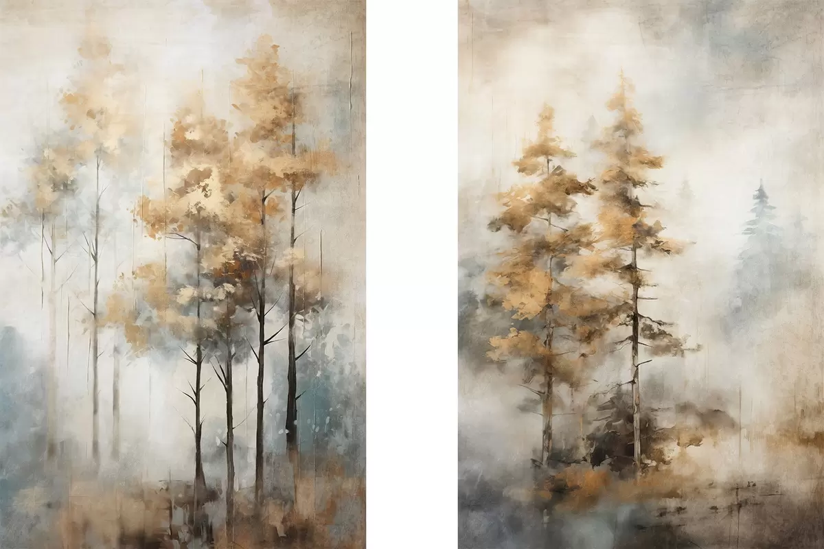 Plakāts Teksturēti augsti koki ar dzeltenām lapām mežā , fons ir maigu zilu un brūnu toņu sajaukums Nr d00528
