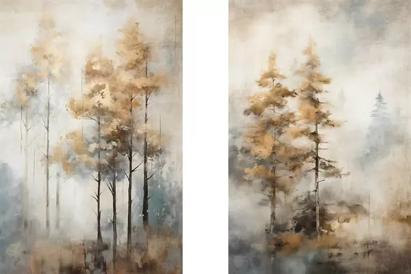 Plakāts Teksturēti augsti koki ar dzeltenām lapām mežā , fons ir maigu zilu un brūnu toņu sajaukums Nr d00528