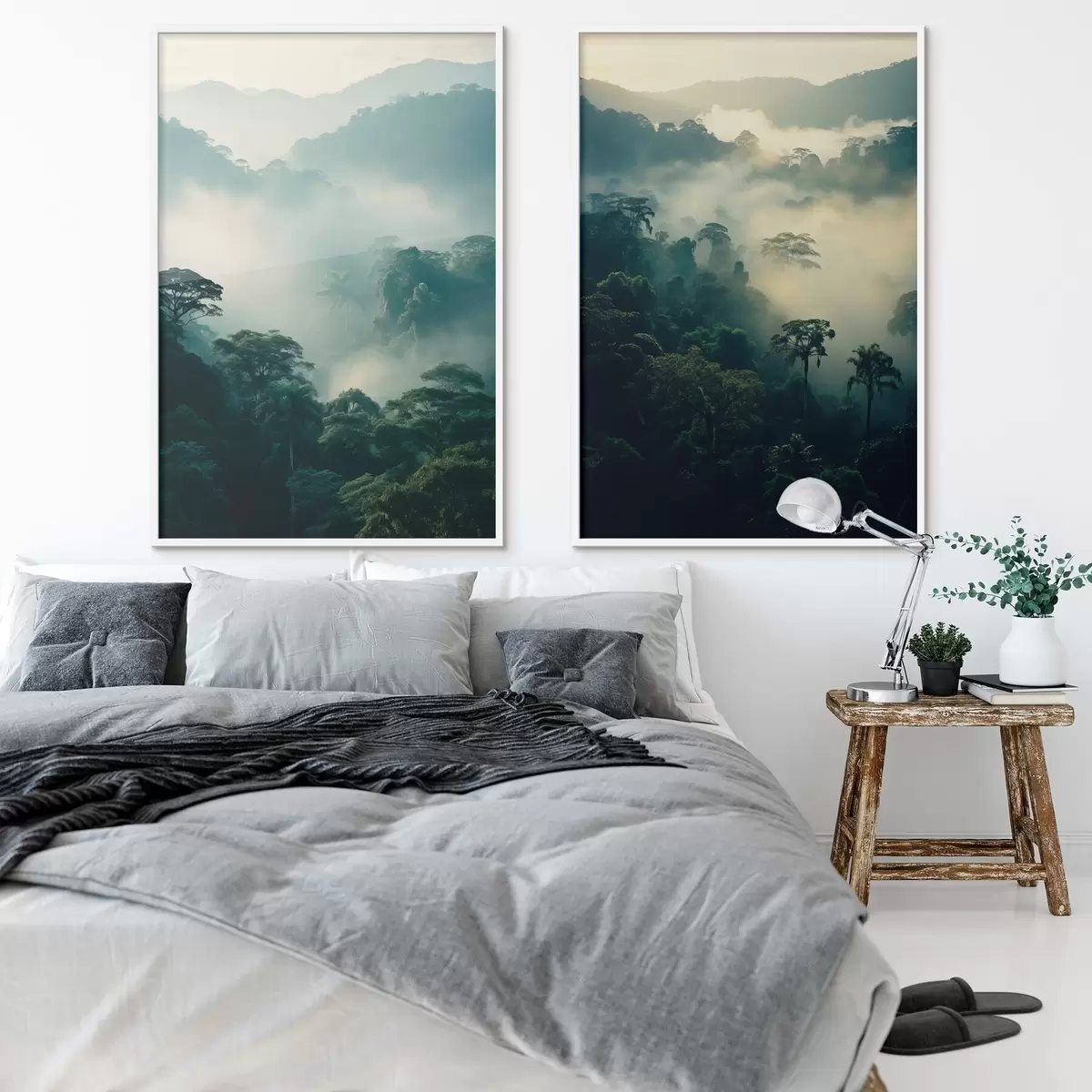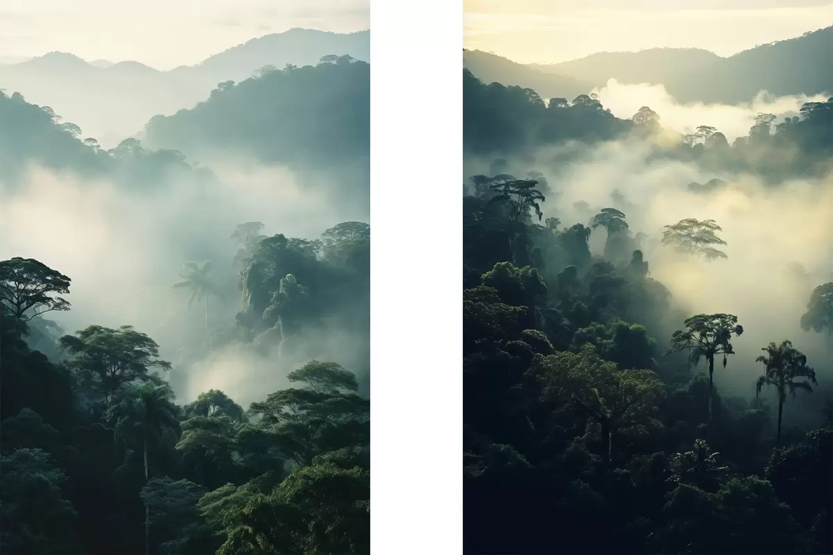 Plakāts Tropu lietus mežs ar sulīgi zaļiem kokiem un biezu miglas slāni, kas rada atmosfērisku vidi Nr d00529