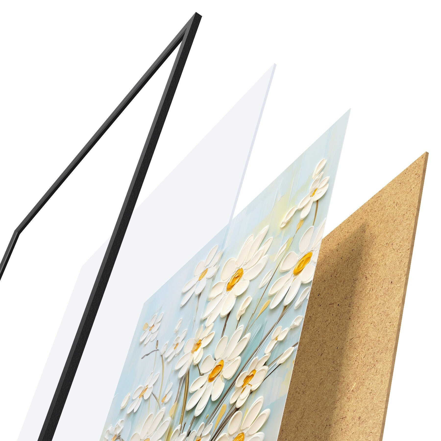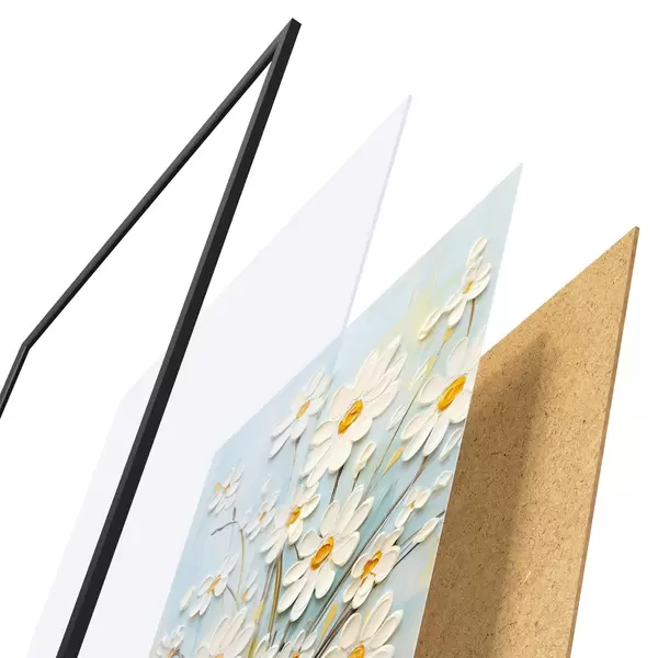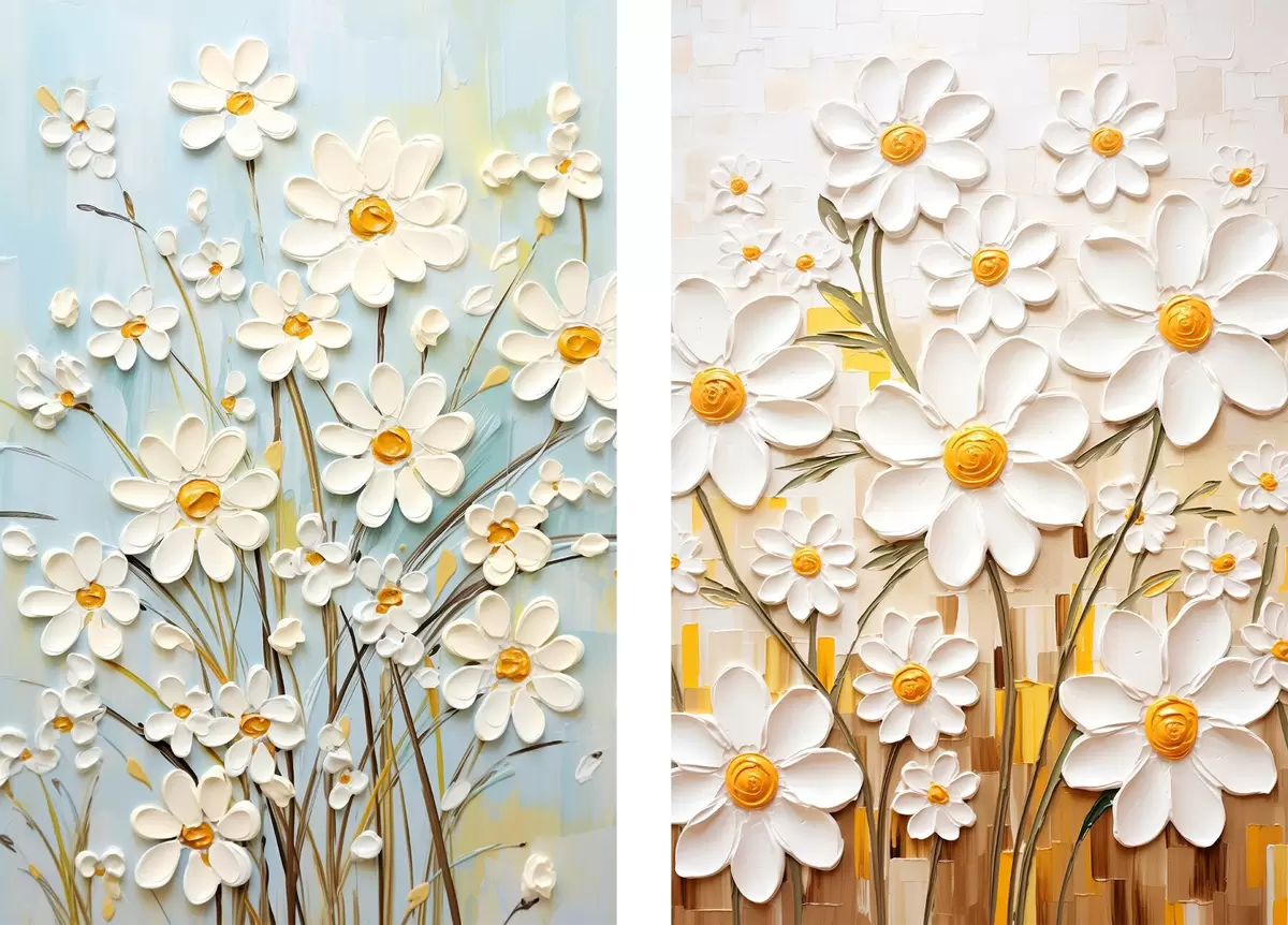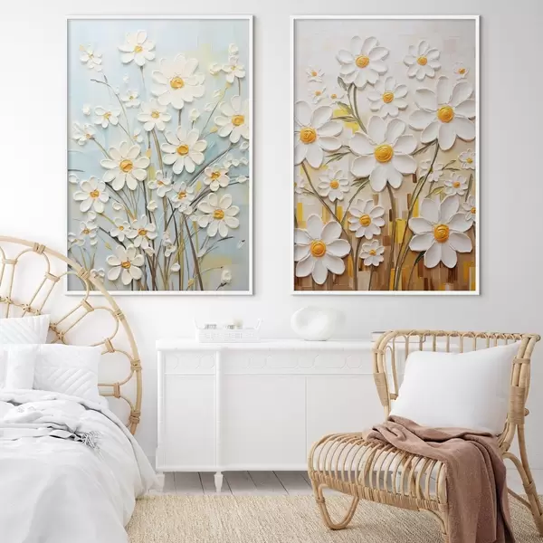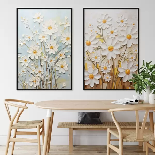 Plakāts Saulaini ziedi: mākslas duets ar apjomīgām margrietiņām un dzelteniem akcentiem Nr d00580