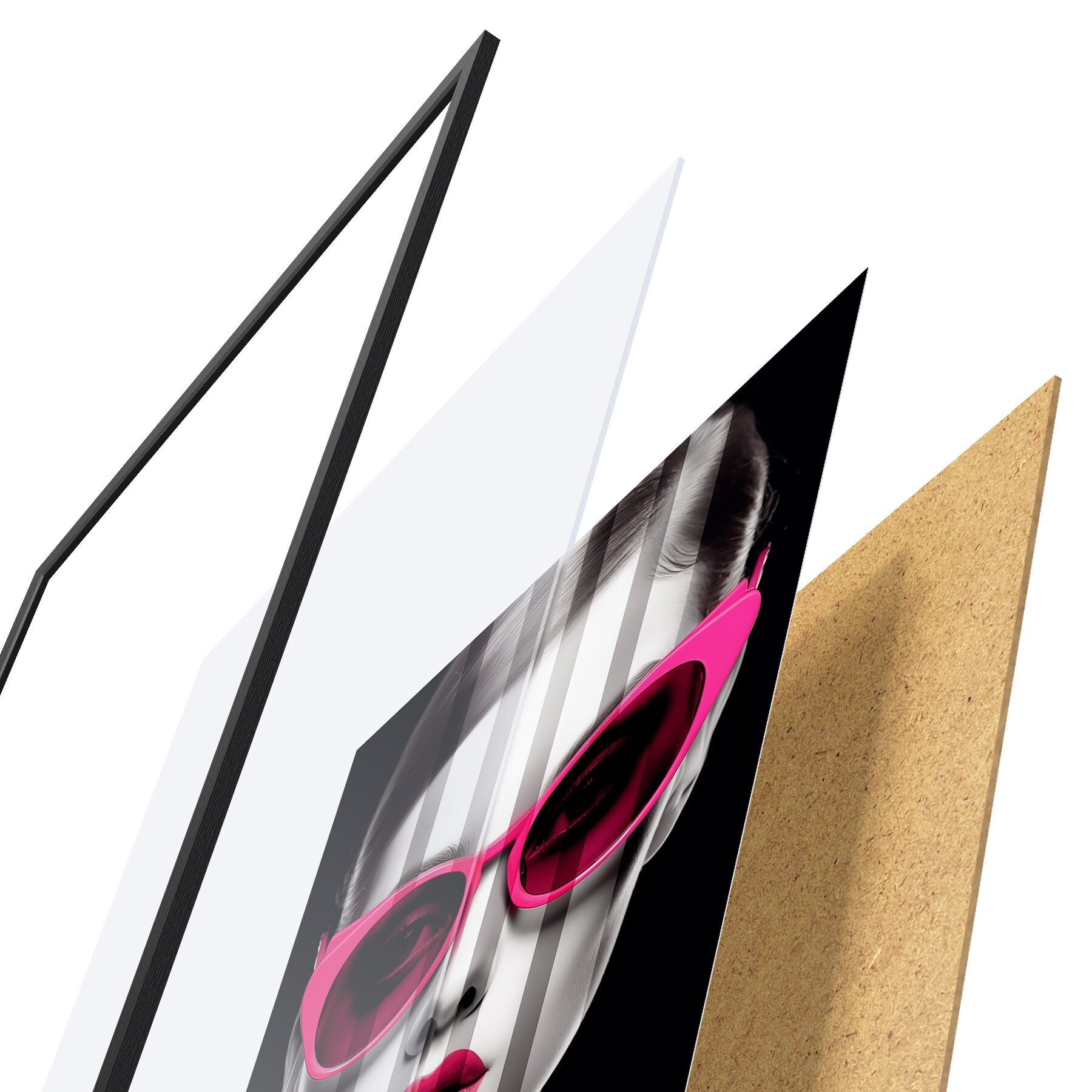 Plakāts sastāv no rāmja, pleksstikla, iespiestā attēla un skaidu plātnes pamatnes. Plakātu var uzreiz piekarināt pie sienas, pateicoties aizmugurē esošajiem stiprinājumiem.