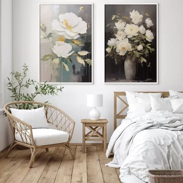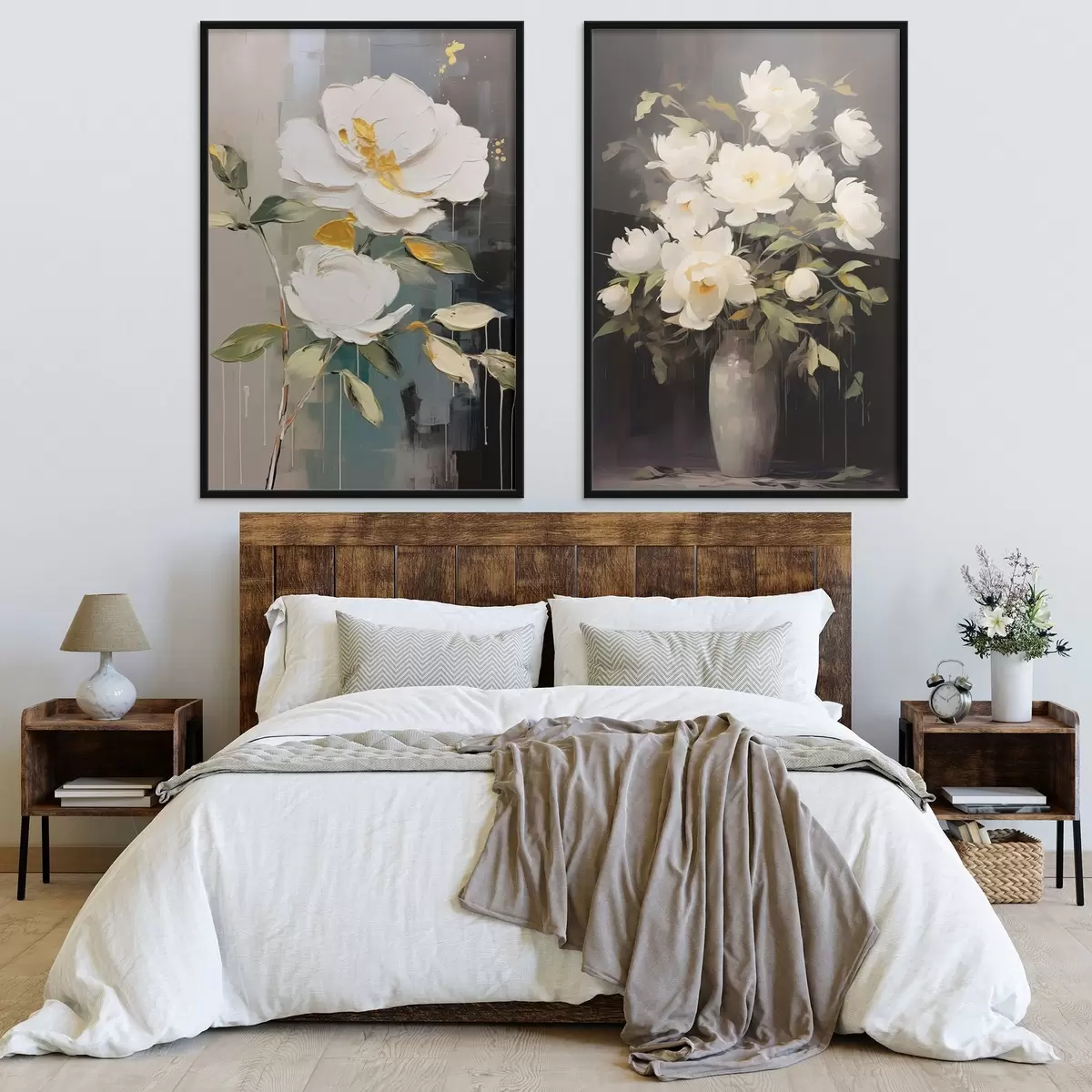 Plakāts Baltas peonijas uz tumša fona: dekoratīva kompozīcija Nr d00634