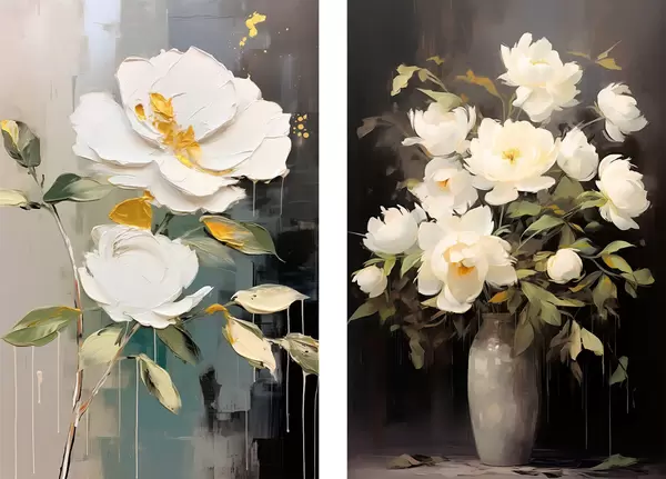 Plakāts Baltas peonijas uz tumša fona: dekoratīva kompozīcija Nr d00634