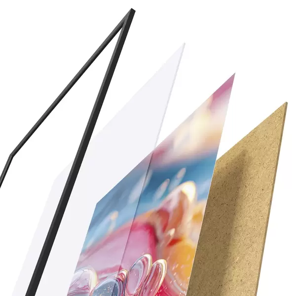 Plakāts sastāv no rāmja, pleksstikla, iespiestā attēla un skaidu plātnes pamatnes. Plakātu var uzreiz piekarināt pie sienas, pateicoties aizmugurē esošajiem stiprinājumiem.