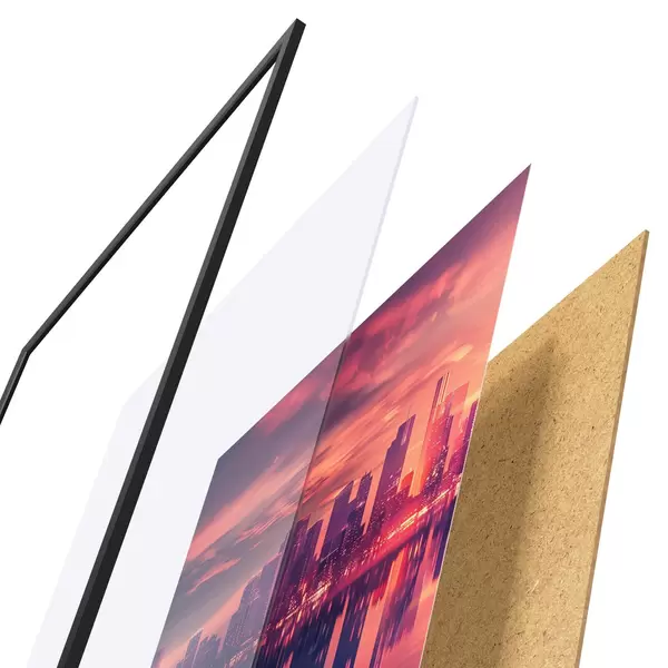 Plakāts sastāv no rāmja, pleksstikla, iespiestā attēla un skaidu plātnes pamatnes. Plakātu var uzreiz piekarināt pie sienas, pateicoties aizmugurē esošajiem stiprinājumiem.
