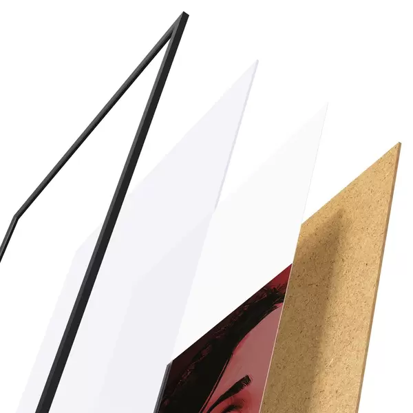 Plakāts sastāv no rāmja, pleksstikla, iespiestā attēla un skaidu plātnes pamatnes. Plakātu var uzreiz piekarināt pie sienas, pateicoties aizmugurē esošajiem stiprinājumiem.