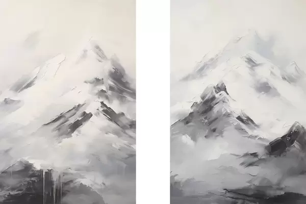 Plakāts Sniegotas kalnu virsotnes ar pelēkiem ēnām, pelēks debesis, otas triepieni, teksturēts, minimālisma stils Nr d00822