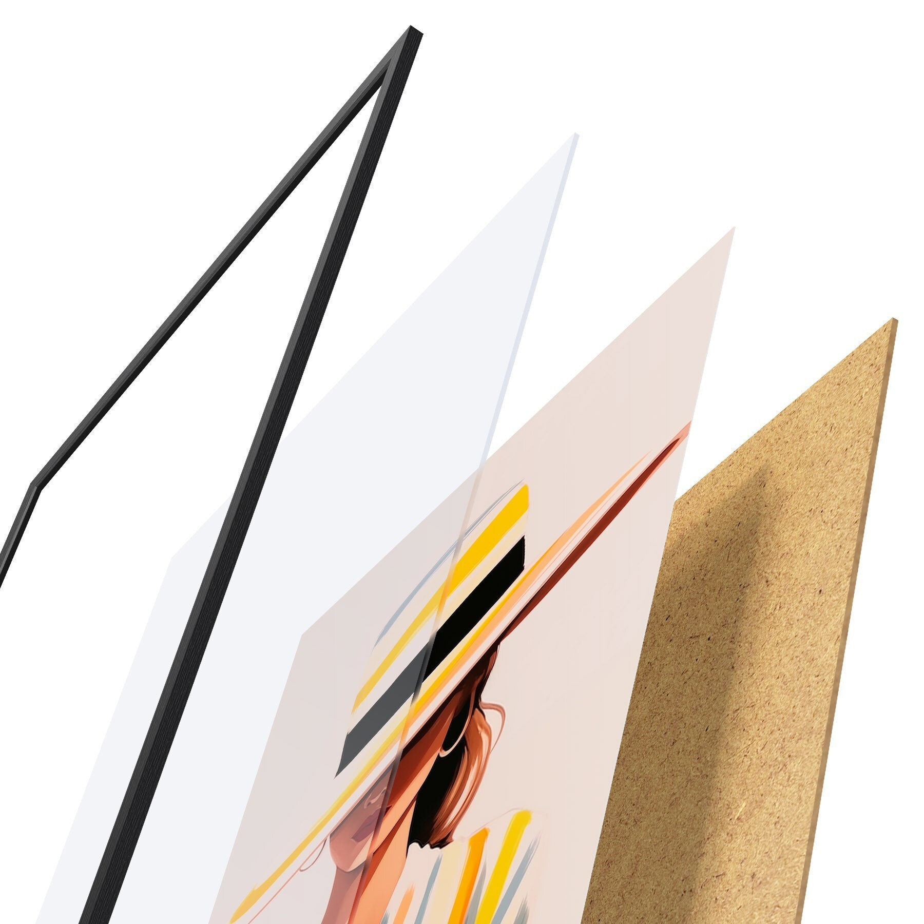 Plakāts sastāv no rāmja, pleksstikla, iespiestā attēla un skaidu plātnes pamatnes. Plakātu var uzreiz piekarināt pie sienas, pateicoties aizmugurē esošajiem stiprinājumiem.