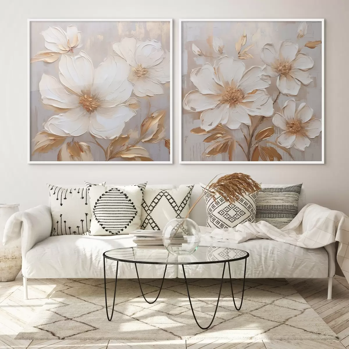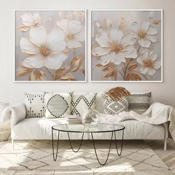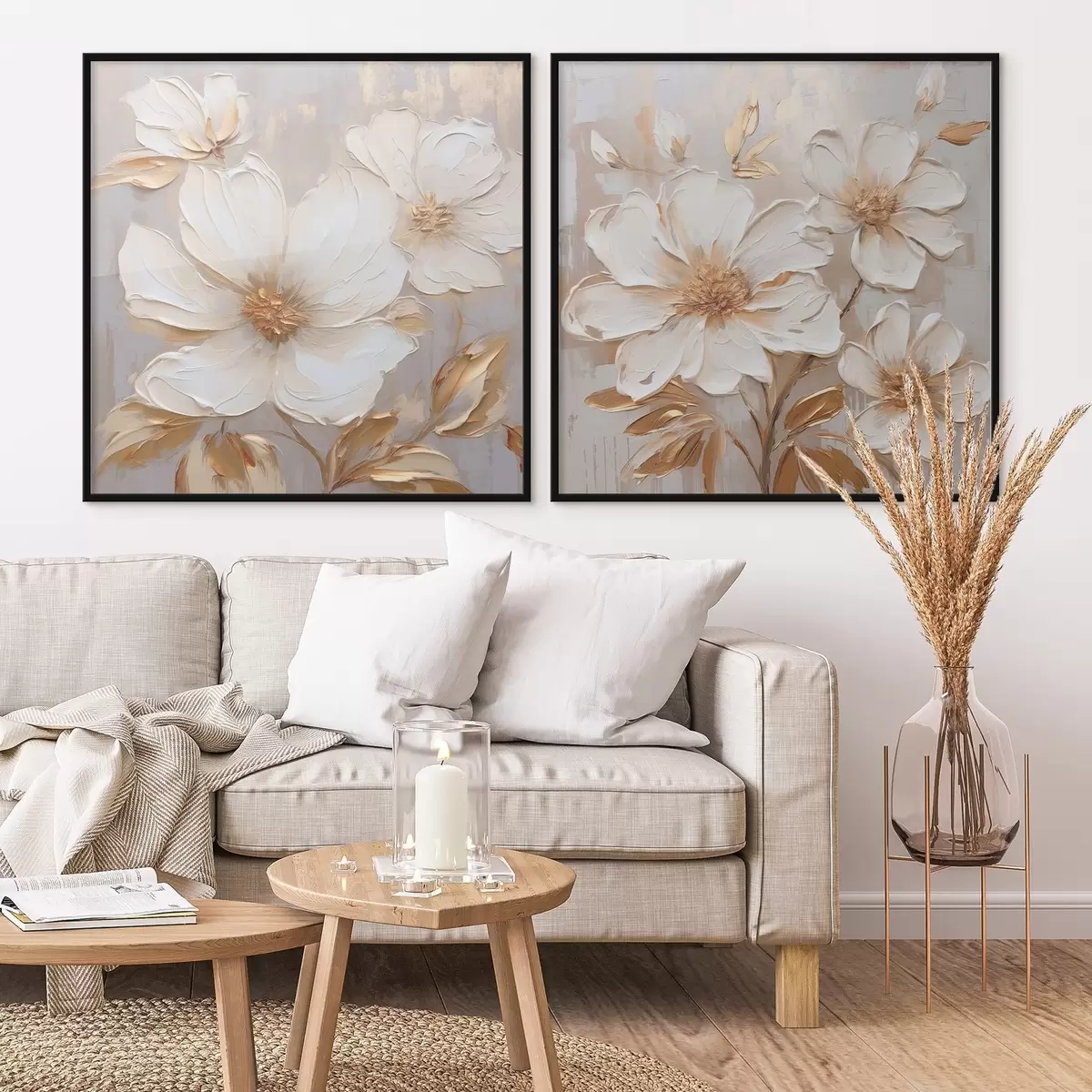 Plakāts Diptihs ar lieliem ziediem gaišās, siltās krāsās Nr d00927