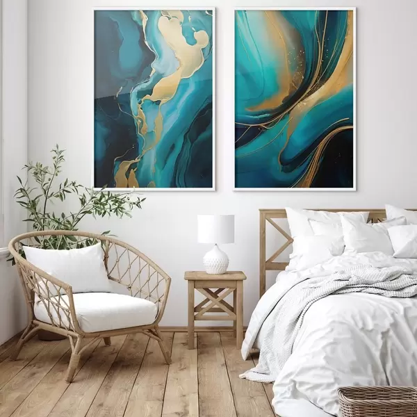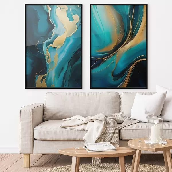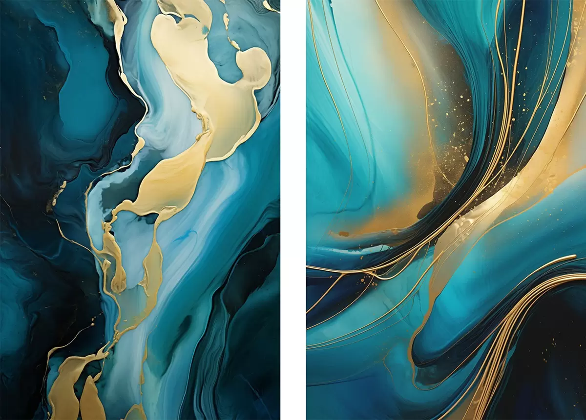 Plakāts Tirkīza krāsas šķidrums ar siltām metāliskiem straumēm Nr d00965