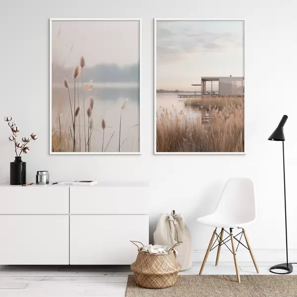 Plakāts Mīkstas niedres pie rāma ezera un moderna māja krastā Nr d00970