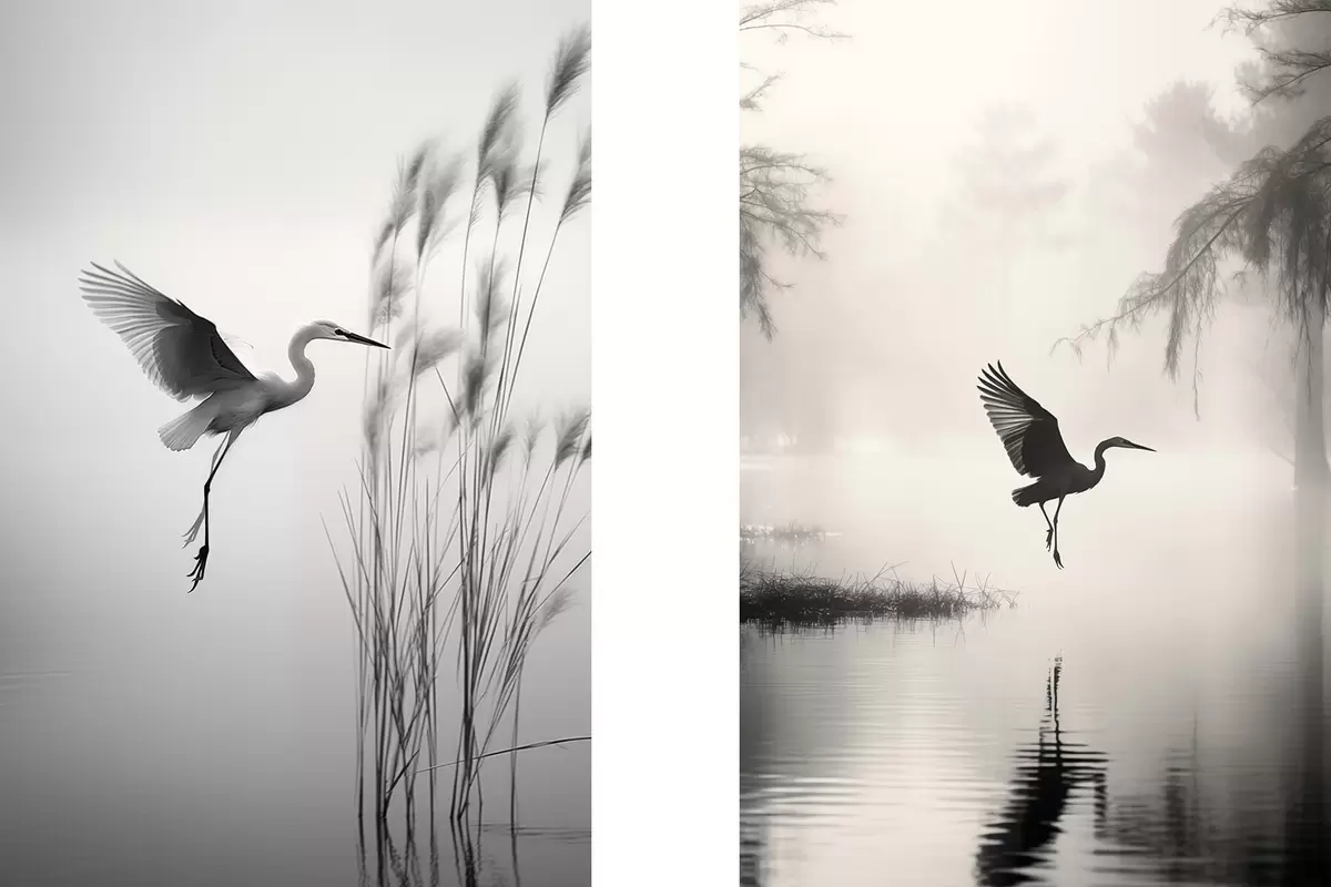 SākumlapaPlakātu katalogsModuļu plakātiPlakāts Baltā gārgale ar izplestiem spārniem, lidojot pie augstiem niedriem, melnbalta minimālisma kompozīcija Nr d01007