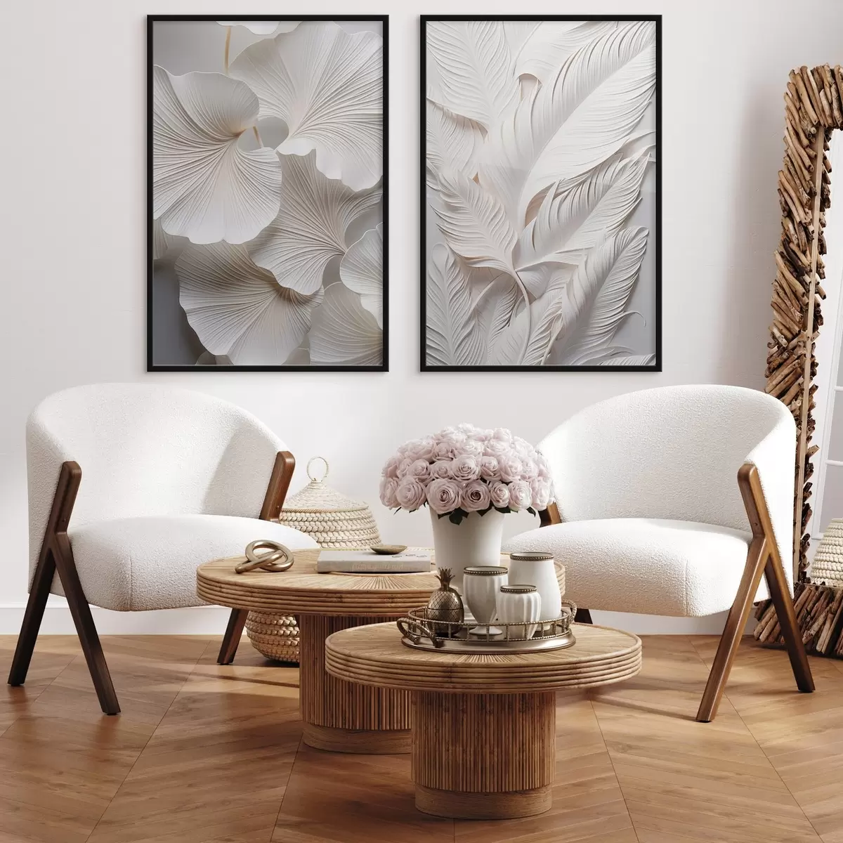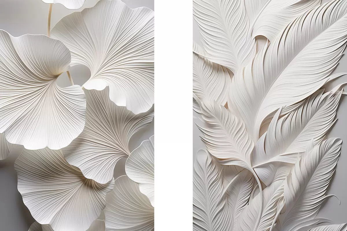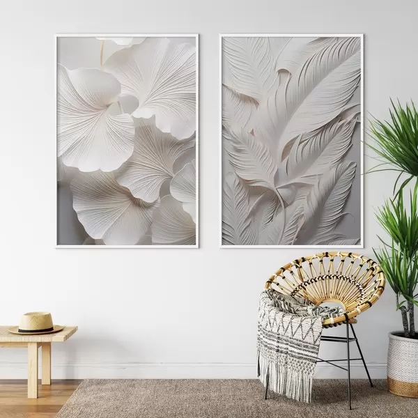 SākumlapaPlakātu katalogsModuļu plakātiPlakāts Baltas ginkgo lapas un garas lapas ar sarežģītiem detaļiem, radot teksturētu un slāņveida efektu, minimālisma māksla Nr d01013