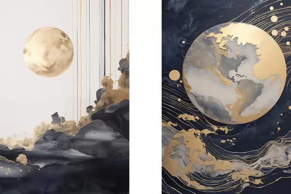 Plakāts Teksturēta dekoratīva planēta kosmosā ar dzeltenām līnijām un punktiem, abstrakts stils, minimālisma un moderns Nr d01014