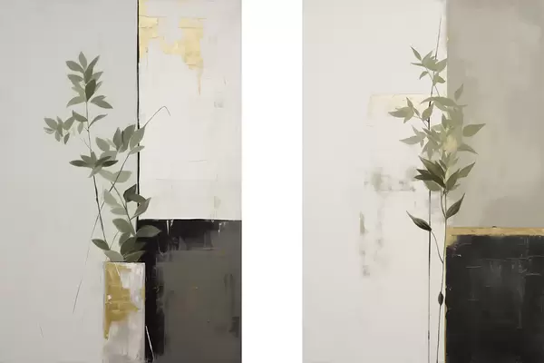 SākumlapaPlakātu katalogsModuļu plakātiPlakāts Minimālisma stilā veidota glezna, kurā attēlota vāze ar zaļām lapām uz abstraktu ģeometrisku figūru fona. Nr d01126