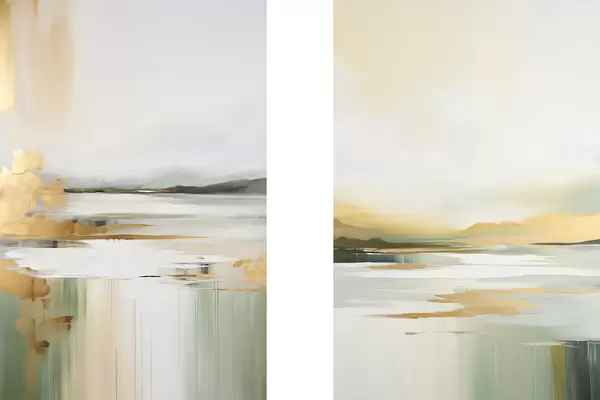 SākumlapaPlakātu katalogsModuļu plakātiPlakāts Abstrakts ainavas ar dzelteniem un zaļiem toņiem, ūdens, kas atspoguļo debesis un tālas kalnus, bāls, miglains debesis Nr d01245