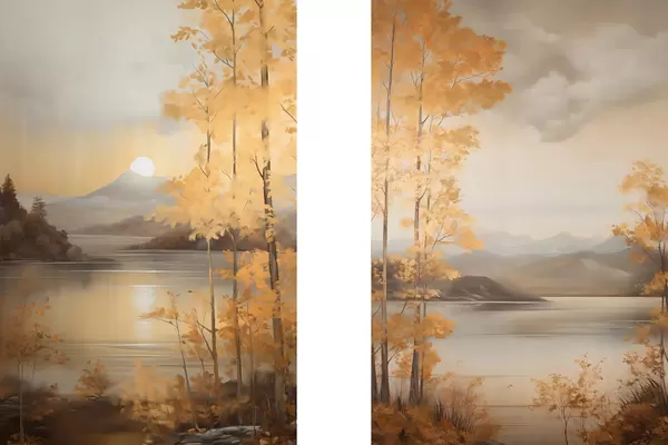SākumlapaPlakātu katalogsModuļu plakātiPlakāts Rudens teksturēti koki ar oranžām lapām ierāmē mierīgu ezeru ar tālumā redzamām kalnām zem apmākušām debesīm. Nr d01246