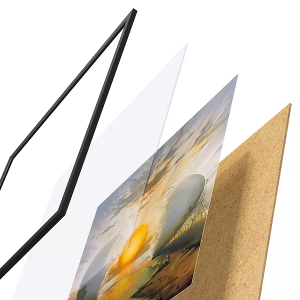 Plakāts sastāv no rāmja, pleksstikla, iespiestā attēla un skaidu plātnes pamatnes. Plakātu var uzreiz piekarināt pie sienas, pateicoties aizmugurē esošajiem stiprinājumiem.