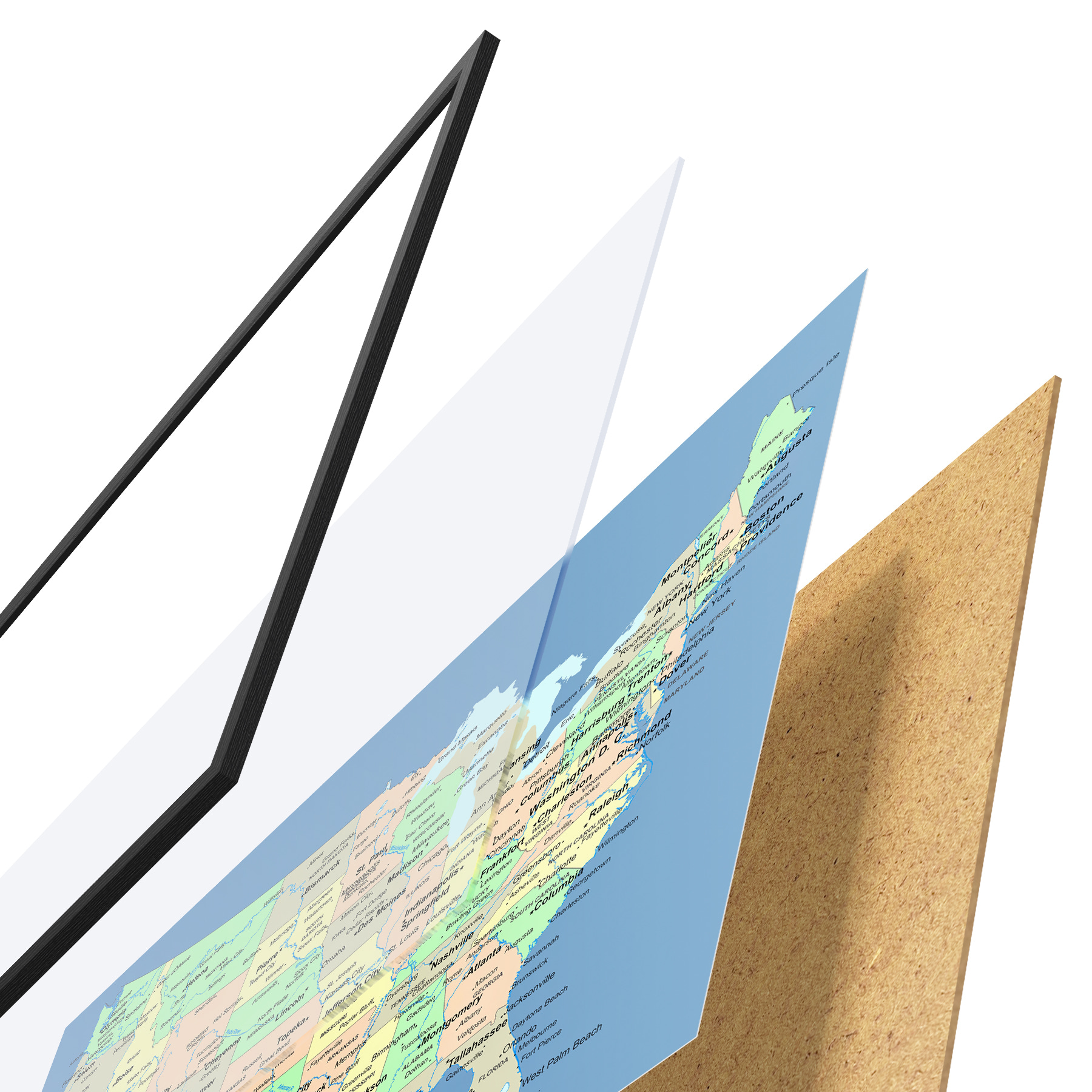 Plakāts sastāv no rāmja, pleksstikla, iespiestā attēla un skaidu plātnes pamatnes. Plakātu var uzreiz piekarināt pie sienas, pateicoties aizmugurē esošajiem stiprinājumiem.