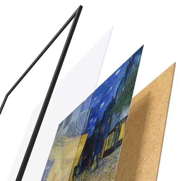 Plakāts sastāv no rāmja, pleksstikla, iespiestā attēla un skaidu plātnes pamatnes. Plakātu var uzreiz piekarināt pie sienas, pateicoties aizmugurē esošajiem stiprinājumiem.
