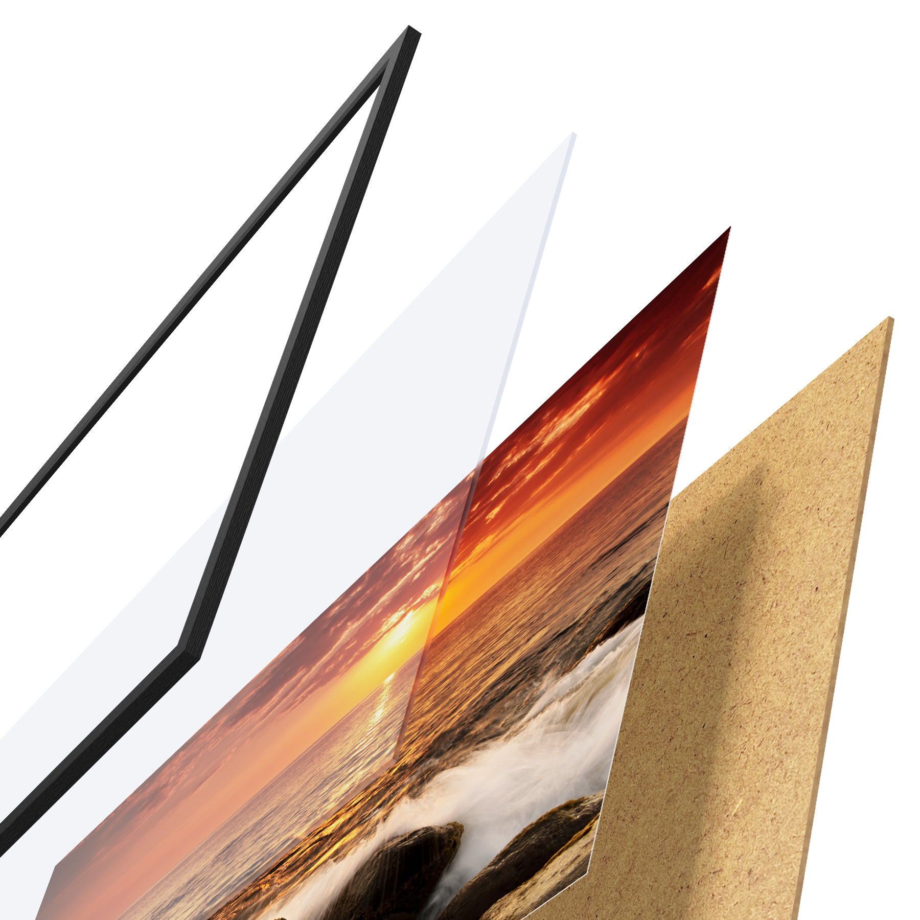 Plakāts sastāv no rāmja, pleksstikla, iespiestā attēla un skaidu plātnes pamatnes. Plakātu var uzreiz piekarināt pie sienas, pateicoties aizmugurē esošajiem stiprinājumiem.