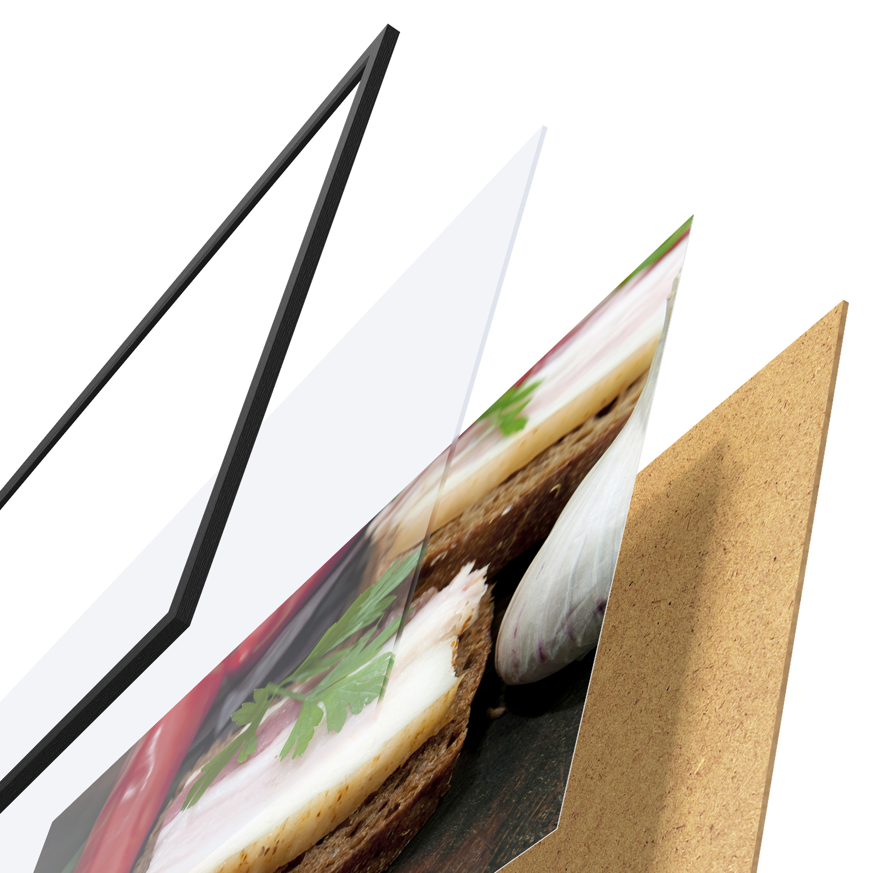 Plakāts sastāv no rāmja, pleksstikla, iespiestā attēla un skaidu plātnes pamatnes. Plakātu var uzreiz piekarināt pie sienas, pateicoties aizmugurē esošajiem stiprinājumiem.