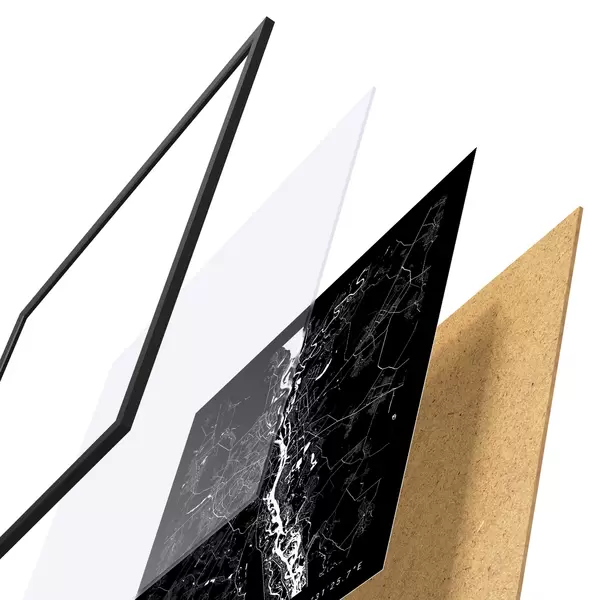 Plakāts sastāv no rāmja, pleksstikla, iespiestā attēla un skaidu plātnes pamatnes. Plakātu var uzreiz piekarināt pie sienas, pateicoties aizmugurē esošajiem stiprinājumiem.