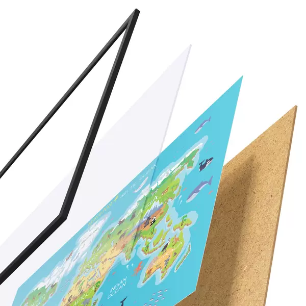 Plakāts sastāv no rāmja, pleksstikla, iespiestā attēla un skaidu plātnes pamatnes. Plakātu var uzreiz piekarināt pie sienas, pateicoties aizmugurē esošajiem stiprinājumiem.