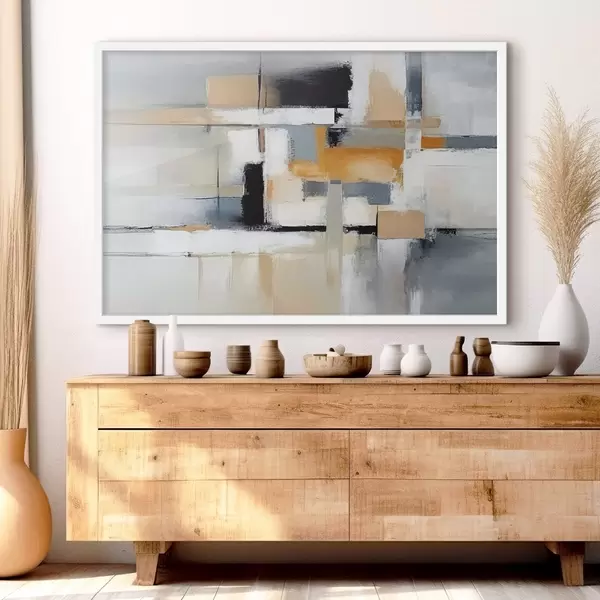 Plakāts Bēšs un pelēks abstrakts ar oranžu un baltu pinumu Nr f36624