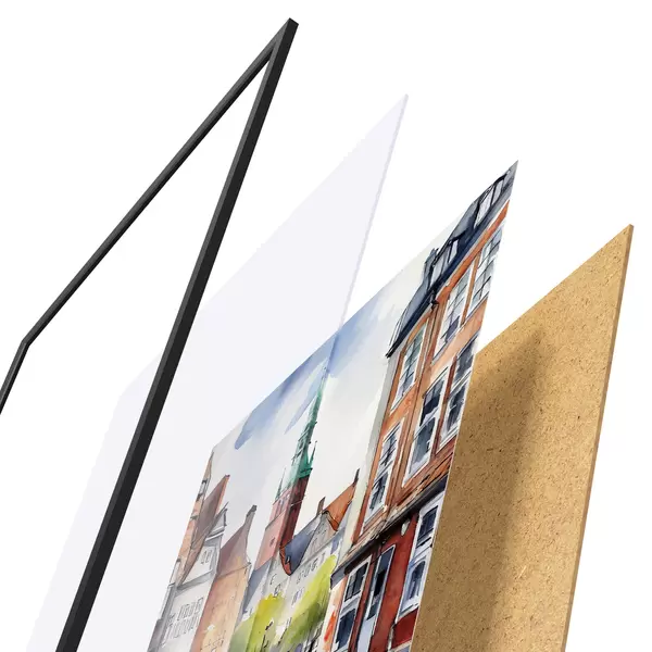 Plakāts sastāv no rāmja, pleksstikla, iespiestā attēla un skaidu plātnes pamatnes. Plakātu var uzreiz piekarināt pie sienas, pateicoties aizmugurē esošajiem stiprinājumiem.