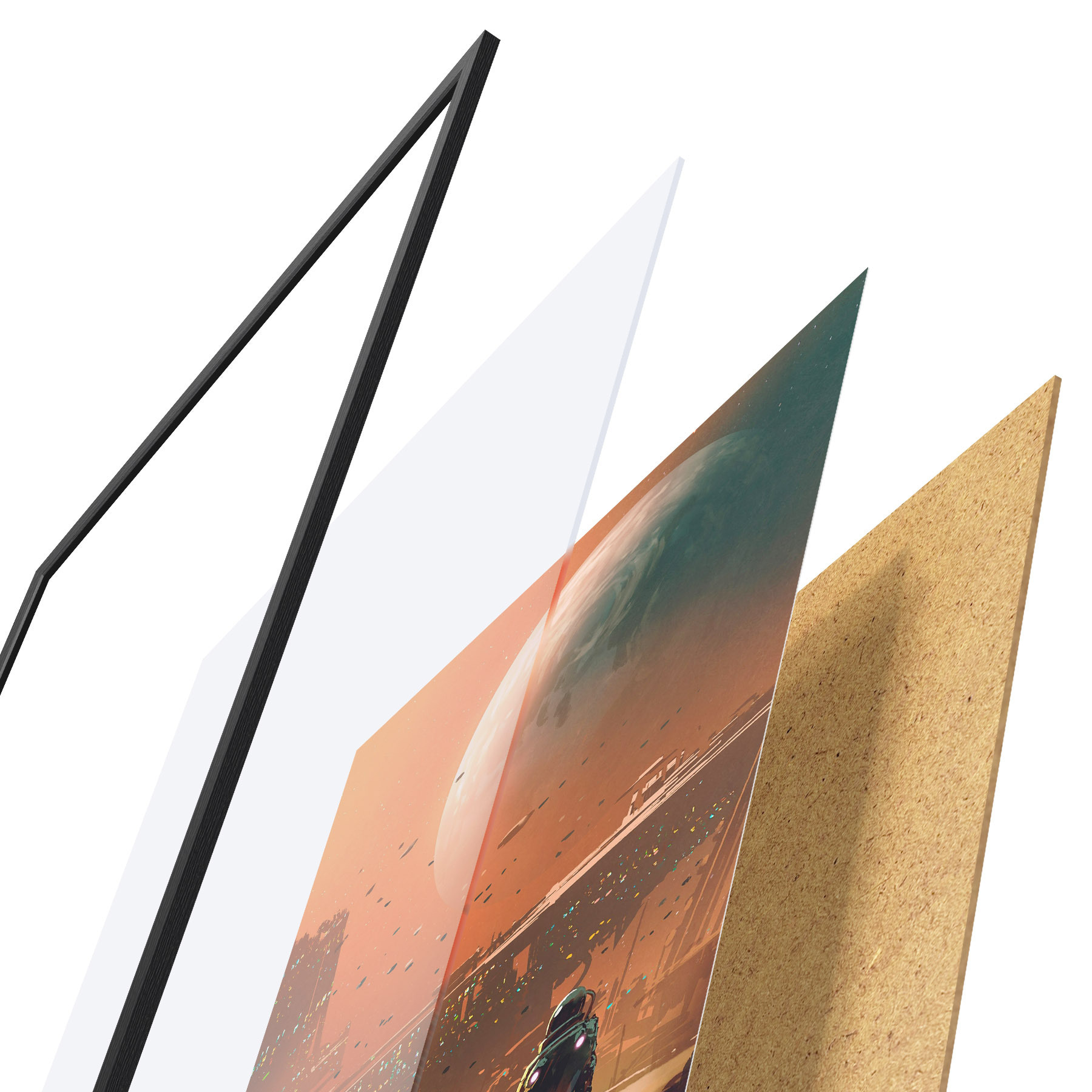 Plakāts sastāv no rāmja, pleksstikla, iespiestā attēla un skaidu plātnes pamatnes. Plakātu var uzreiz piekarināt pie sienas, pateicoties aizmugurē esošajiem stiprinājumiem.